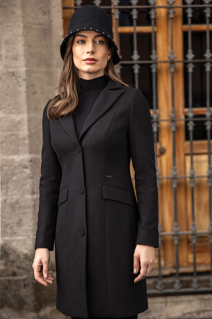 ABRIGO CON CUELLO Y SOLAPA DE LANZA. DELANTERO CON CORTE FRANCES, ABROCHA CON 3 BOTONES FORRADOS DE LA MISMA TELA, BOLSAS DE VIVO Y CARTERA. COSTADILLO RECTO. ESPALDA RECTA. MANGA LARGA DE DOS PIEZAS. ABRIGO CON FORRO. PLACA EN VIVO LADO IZQUIERDO