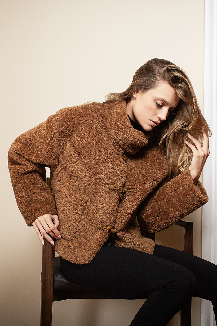 ABRIGO CORTO CUELLO ALTO CON ALAMARES EN EL FRETE. DOS BOLSA EN DELANTERO Y MANGA LARGA
