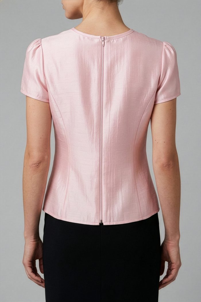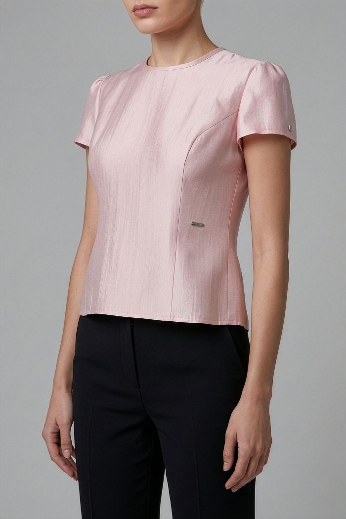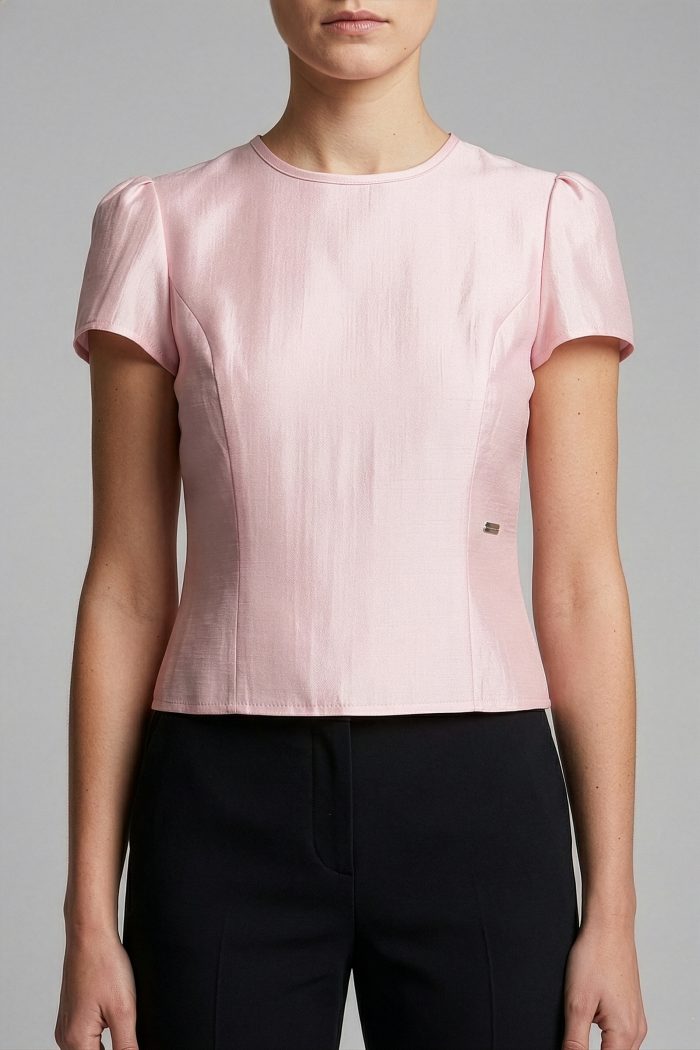 BLUSA CON ESCOTE REDONDO CON BIES. TALLE DELANTERO CON CORTE TIPO PRINCESA. TALLE ESPALDA CON CORTE PRINCESA. MANGA CORTA DE UNA PIEZA CON FRUNCE EN CABEZA MANGA. PLACA MUSSI EN CINTURA IZQUIERDA. PLACA MEXICO EN MANGA IZQUIERDA