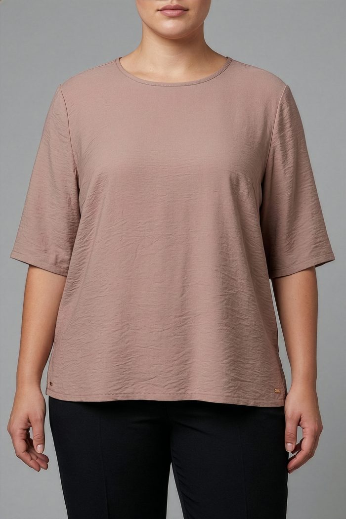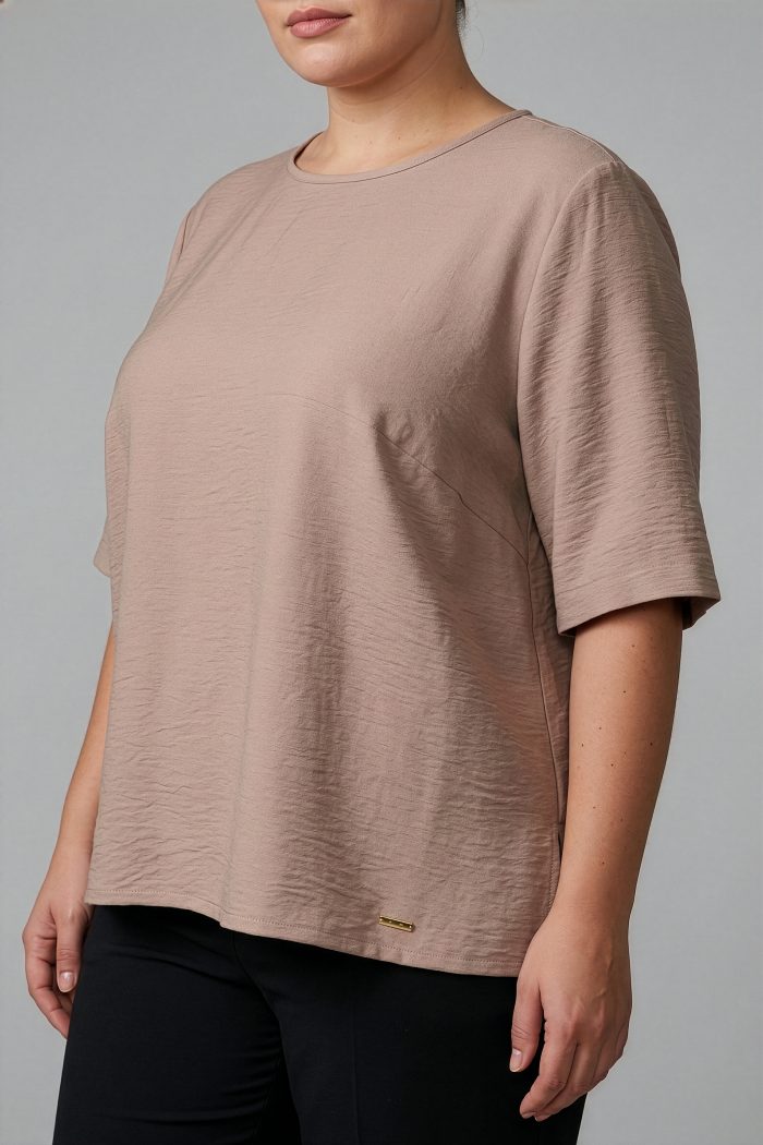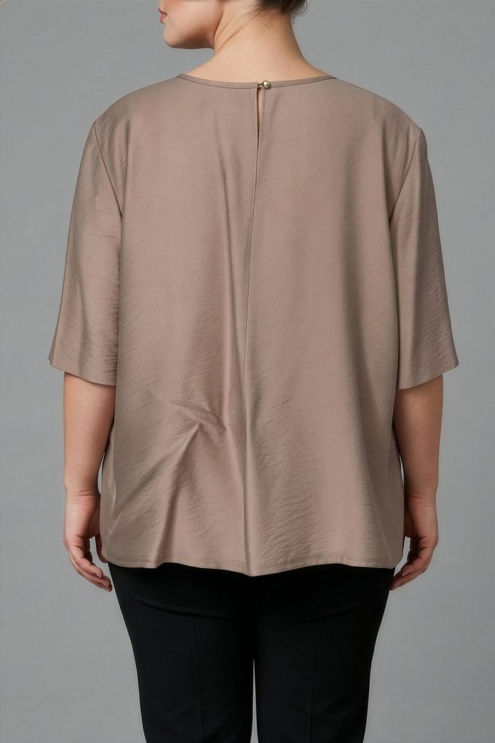 BLUSA CON ESCOTE REDONDO CON BIES EN CONTORNO. DELANTERO CON PINZA DE BUSTO, ABERTURA EN COSTADOS. ESPALDA CON COSTURA EN CENTRO, ABERTURA EN ESCOTE CON BOTON DORADO Y PRECILLA. MANGA CORTA DE UNA PIEZA. PLACA MUSSI EN RUEDO LADO IZQUIERDO. PLACA MEXICO EN RUEDO LADO DERECHO