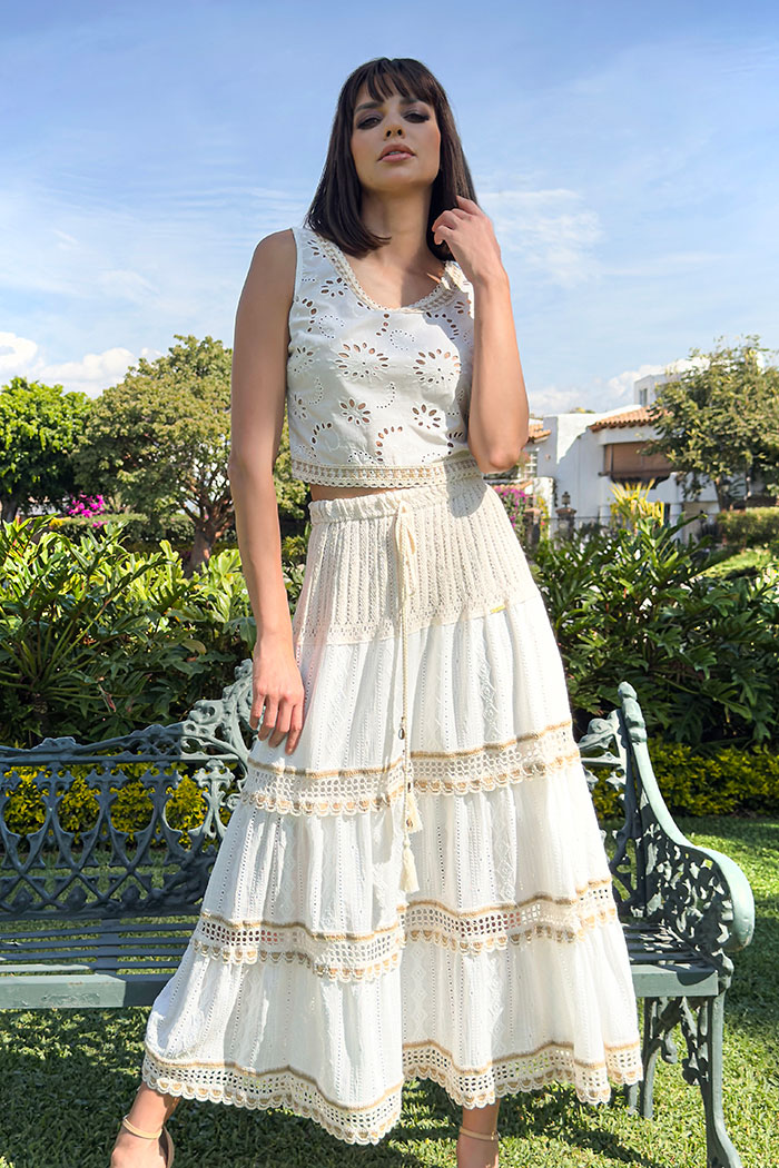 BLUSA: CORTA EN TELA DE ALGODÓN BORDADO, DELANTERO ESCOTE RDONDO, PINZA DE COSTADO A BUSTO, LLEVA TIRA DE CÍRCULOS DE ALGODÓN AL CONTORNO DE ESCOTE Y CINTURA. ESPALDA: ESCOTE REDONDO, PINZA EN TALLE Y CIERRE SEPARABLE AL CENTRO, CON LA MISMA IDEA DE LA TIRA DE CÍRCULOS. VÁ SISADA Y LLEVA UN BIES DE LA MISMA TELA.