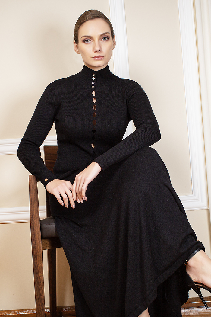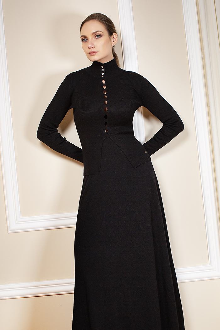 BLUSA EN TEJIDO DE PUNTO CON CUELLO ALTO Y APERTURA EN EL CENTRO EN LA PARTE DELANTERA BAJA DE LA BLUSA, MANGA LARGA