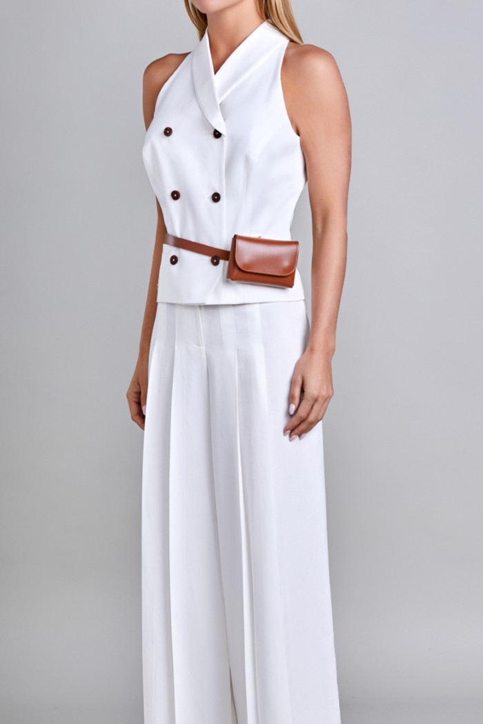 CHALECO CUELLO TIPO CHAL. DELANTERO CON CRUCE, LLEVA 6 BOTONES EN DELANTERO. DELANTERO CON INCLINACION EN FILO DELANTERO Y RUEDO. TALLE DELANTERO CON CORTE TIPO PRINCESA, VIVO DE ALETILLA. PLACA MUSSI EN LADO IZQUIERDO ABAJO DEL VIVO. PLACA MEXICO EN RUEDO LADO DERECHO EN COSTADO. TALLE ESPALDA TIPO HALTER EN ESCOTE, CORTE TIPO PRINCESA EN TALLE. FORRO DE TAFETA. ACCESORIO DE CINTURON CON BOLSA.