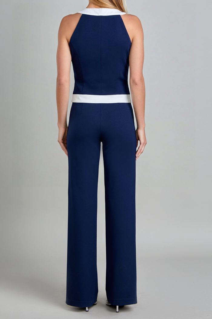 CHALECO ESCOTE EN “V” TIPO HALTER. CON INCRUSTACIÓN EN TODO EL FILO Y 4 BOTONES AL FRENTE,CORTE PRINCESA , LLEVA BOLSA DE VIVOS CON CARTERAS EN COMBINACIÓN CON UN BOTON DE ADORNO. ESPALDA CORTE PRINCESA , LLEVA INCRUSTACIÓN EN TODO EL RUEDO DELANTERO Y ESPALDA.