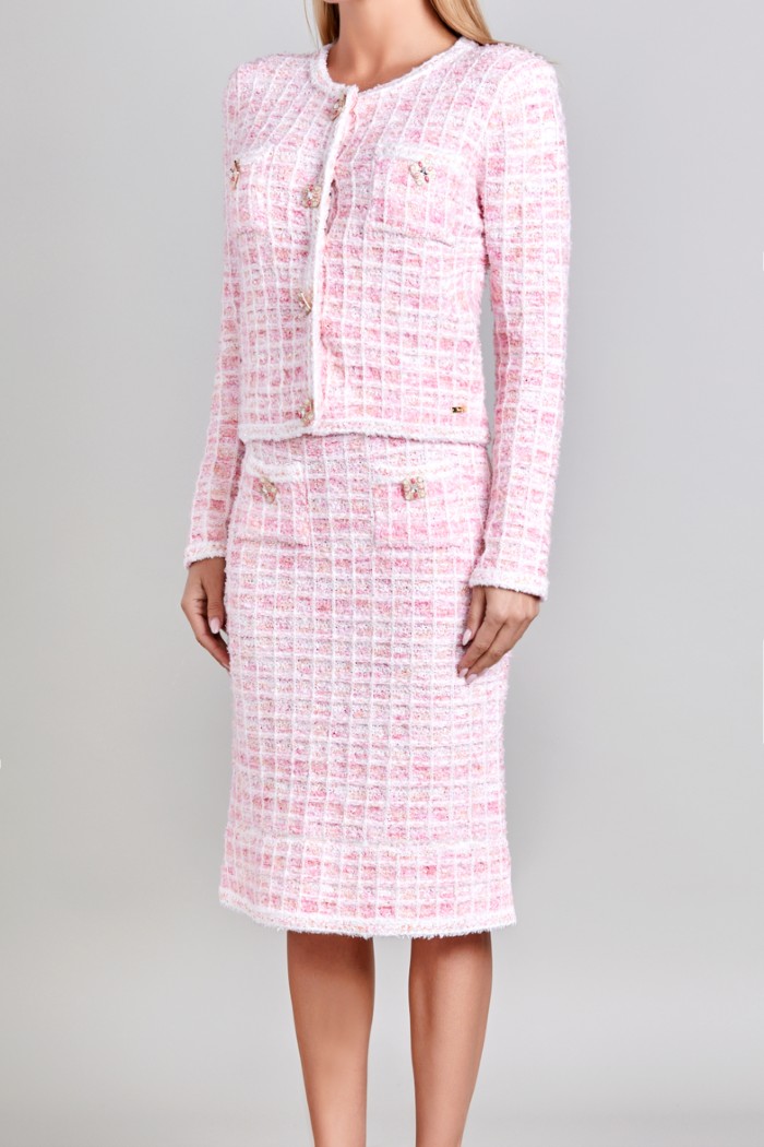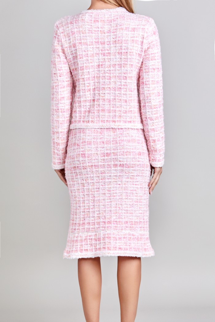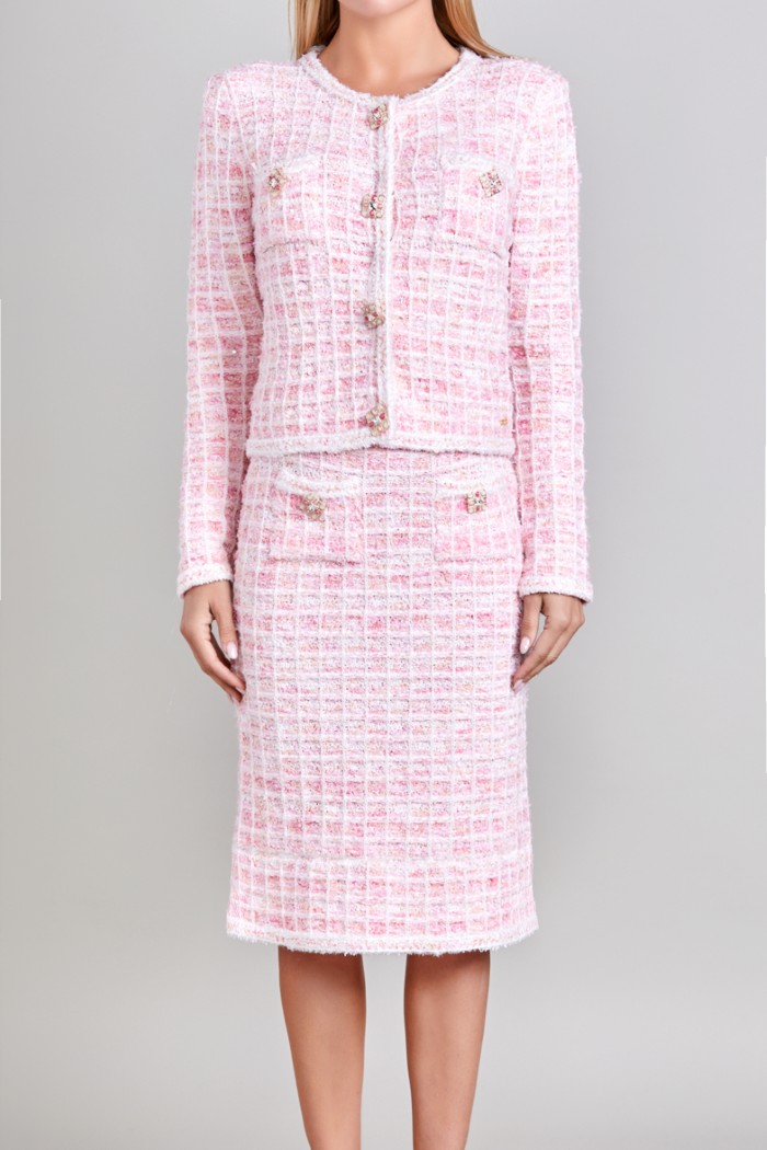 CONJUNTO DE SACO Y FALDA, SACO MANGA LARGA, CUELLO REDONDO, BOTONES AL FRENTE FALDA ABAJO DE LA RODILLA, ADORNOS AL FRENTE