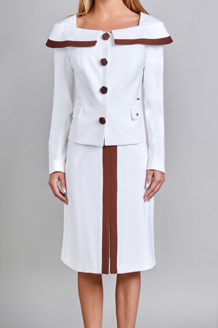 FALDA, CINTURA CON VISTAS EN EL INTERIOR CON FILO EN CENTRO DE COLOR CONTRASTE CAFE. DELANTERO CON PINZA LATERAL , FALDA LINEA A Y ABERTURA DELANTERA EN CENTRO. FALDA ESPALDA CON CIERRE EN CENTRO ESPALDA. PINZA LATERAL Y FORRO DE BOMBAY EN FALDA. PLACA MUSSI EN CINTURA LADO IZQUIERDO. PLACA MEXICO EN RUEDO DERECHO