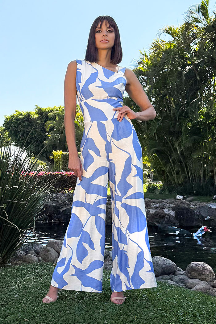 JUMPSUIT: DELANTERO CON ESCOTE ASIMÉTRICO, TIRANTE DE LADO IZQUIERDO, PINZAS DE COSTADO A BUSTO Y TALLE, CORTE IMPERIO. ESPALDA: CON ESCOTE ASIMÉTRICO, TIRANTE DE LADO IZQUIERDO PINZAS EN EL TALLE, CIERRE INVISIBLE AL CENTRO. PARTE BAJA CON AMPLITUD