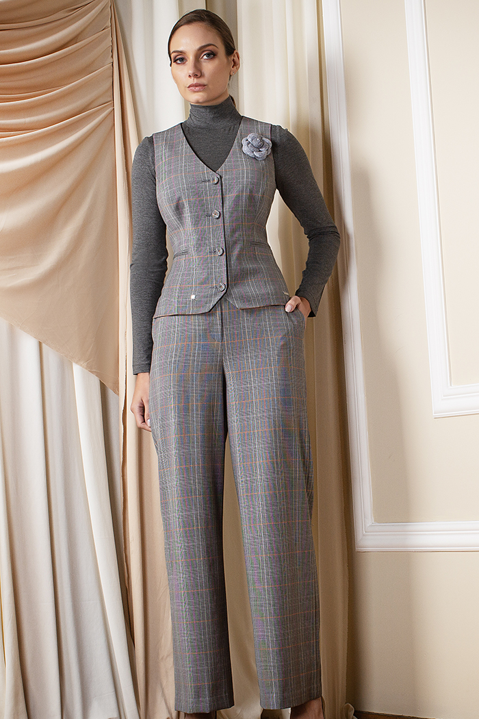 PANTALON CON PRETINA CURVA DE TRES PIEZAS. BROCHE INTERNO EN PRETINA, CIERRE EN DELANTERO CON OJALERA. DELANTERO RECTO CON PIERNA AMPLIA, BOLSA DIAGONAL EN COSTADO. TRACERO CON PINZA LATERAL, BOLSA DE VIVO DE ALETILLA, PIERNA AMPIA. PLACA MUSSI Y PLACA HECHO EN MEXICO EN CINTURA IZQUIERDA