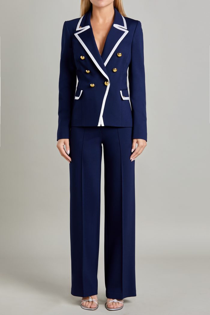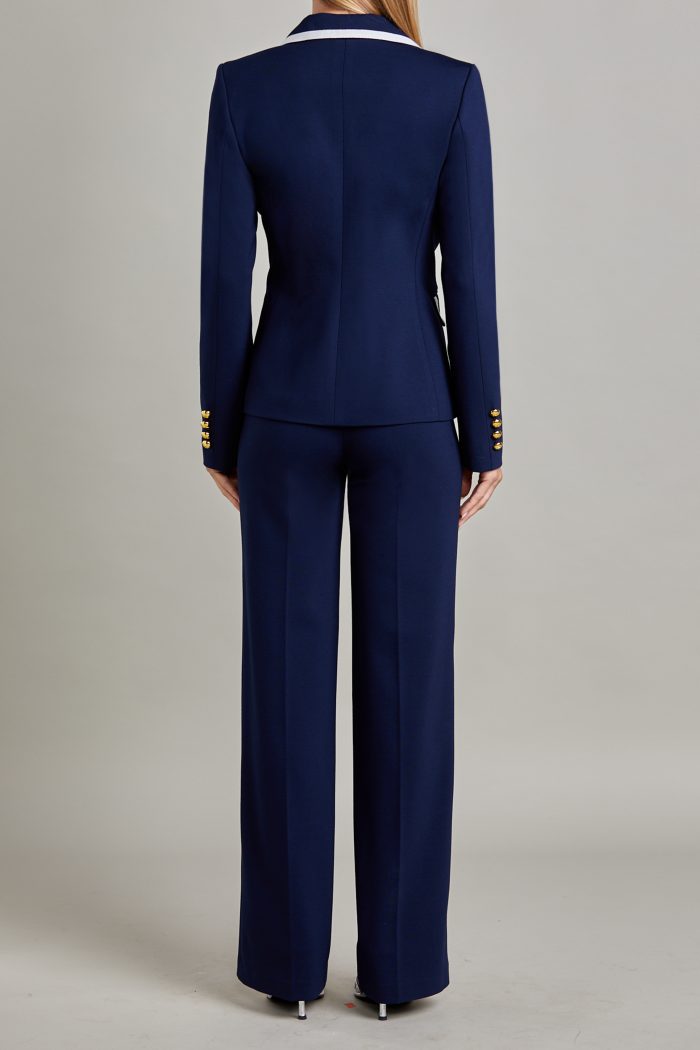 PANTALON CON PRETINA CURVA DE TRES PIEZAS CON PASE. BROCHE TIPO CABALLERO Y OJAL Y BOTON INTERNO. PIERNA RECTA CON COSTILLA EN QUIEBRCIERRE EN DELANTERO OJALERA Y FALSO INTERNOS. TRACERO CON PIERNA RECTA