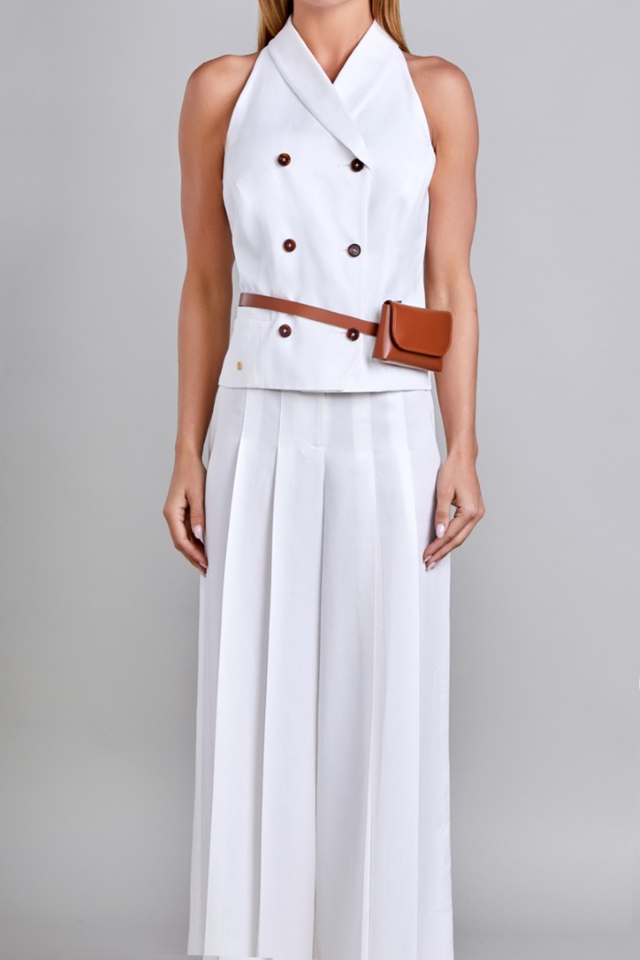 PANTALON CON PRETINA CURVA DE TRES PIEZAS CON PASE. BROCHE TIPO CABALLERO Y BOTON DE CONTRA, LLEVA TRABAS EN PRETINA. OJALERA Y FALSO. DELANTERO CON 2 TABLONES QUE VAN FIJADOS HASTA LA CADERA PIERNA AMPLIA. TRACERO CON PINZA LATERAL Y PIERNA AMPLIA. PLACA MUSSI EN LADO IZQUIERDO EN CINTURA. PLACA MEXICO EN LADO DERECHO