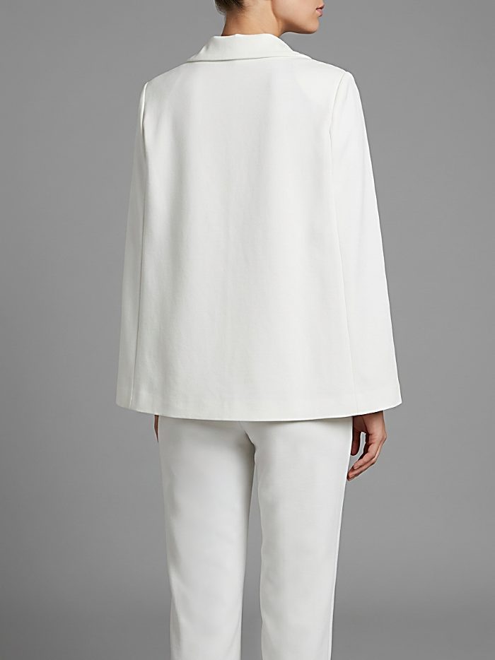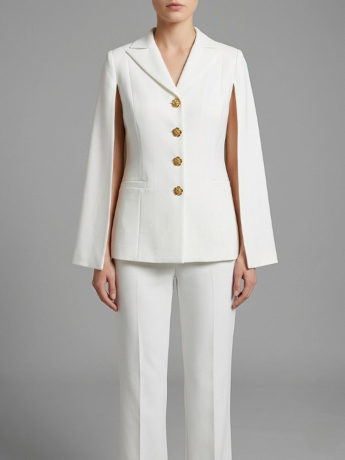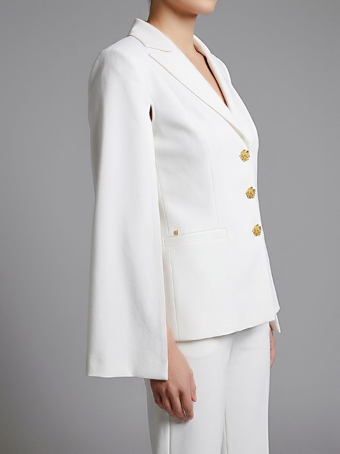 SACO: RECTO CUELLO Y SOLAPA PUNTA DE LANZA, CORTE FRANCÉS, LLEVA CAPA INTEGRADA, BOLSAS DE VIVO CON FUNCIÓN, CIERRA CON CUATRO BOTONES FORRADOS AL FRENTE. ESPALDA: Y COSTADILLO CON CAPA INTEGRADA, INCLUYENDO MANGA. MANGA:LARGA QUE VÁ FIJA A MITAD DE SISA DELANTERA. TODA LA PRENDA VÁ FORRADA.