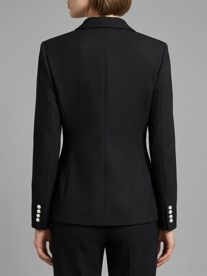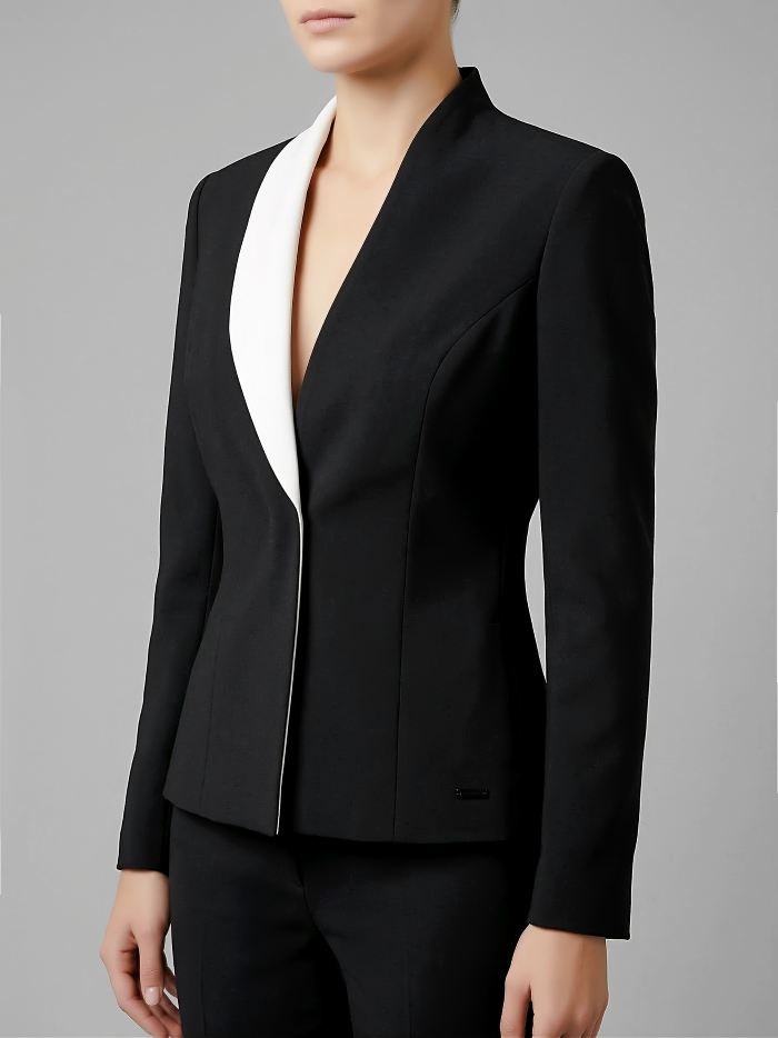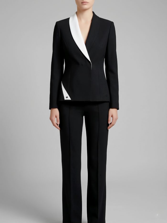 SACO CRUZADO SOLAPA DE SHALL EN COMBINACIÓN SOLO DE LADO DERECHO Y ESCOTE EN “V” DE LADO IZQUIERDO. CORTE PRINCESA. EN EL LADO DERECHO EN EL CORTE PRINCESA TIENE UN CORTE Y UN TRIANGULO EN COMBINACIÓN, LLEVA COSTADILLO Y ESPALDA DE 2 PIEZAS. MANGA LARGA TIPO SASTRE.