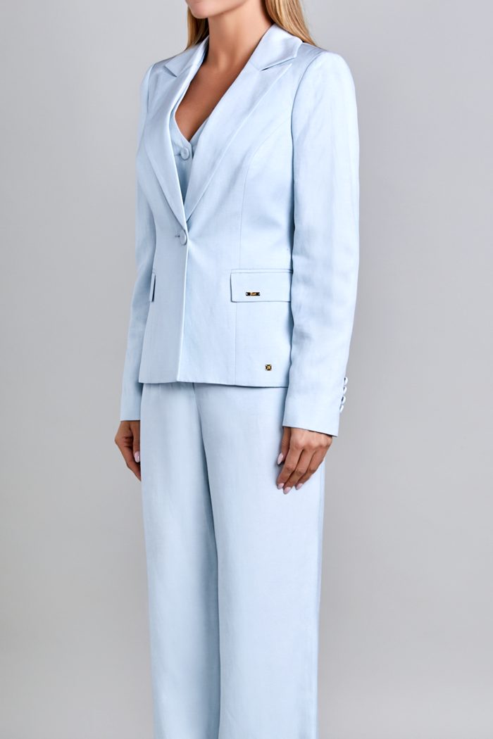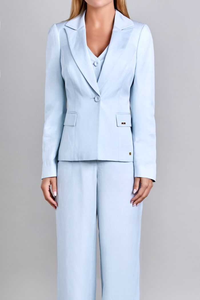 SACO CON CUELLO Y SOLAPA DE LANZA. DELANTERO CON CORTE TIPO PRINCESA,BOLSA DE VIVO CON CARTERA. ABROCHA CON UN BOTON FORRADO EN CINTURA. COSTADILLO RECTO. ESPALDA CON COSTURA EN CENTRO. MANGA LARGA DE DOS PIEZAS CON BOTONES DE ADORNO (4)EN PUÑO. SACO CON FORRO DE TAFETA. PLACA MUSSI EN CARTERA IZQUIERDA. PLACA MEXICO EN RUEDO LADO DERECHO