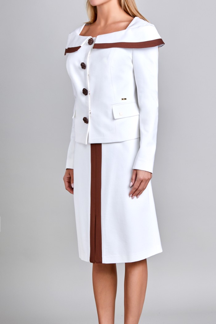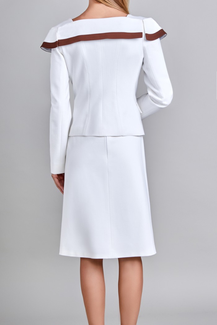 SACO CON HOMBROS DESCUBIERTOS, TIRANTE ANGOSTO. TIRA EN ESCOTE CON DOS TONOS EN CONTORNO (HUESO-CAFE). BOTON DE FLOR EN DELANTERO, LLEVA BROCHES INTERNOS EN DELANTERO CON CINTA POPOTILLO COMO REFUERZO DE BROCHES. TALLE CON CORTE TIPO FRANCES, BOLSA DE VIVO CON CARTERA. FORRO DE TAFETA EN EL TALLE. MANGA LARGA DE DOS PIEZAS SIN FORRO. PLACA MUSSI EN CINTURA LADO IZQUIERDO. PLACA MEXICO EN CARTERA IZQUIERDA.