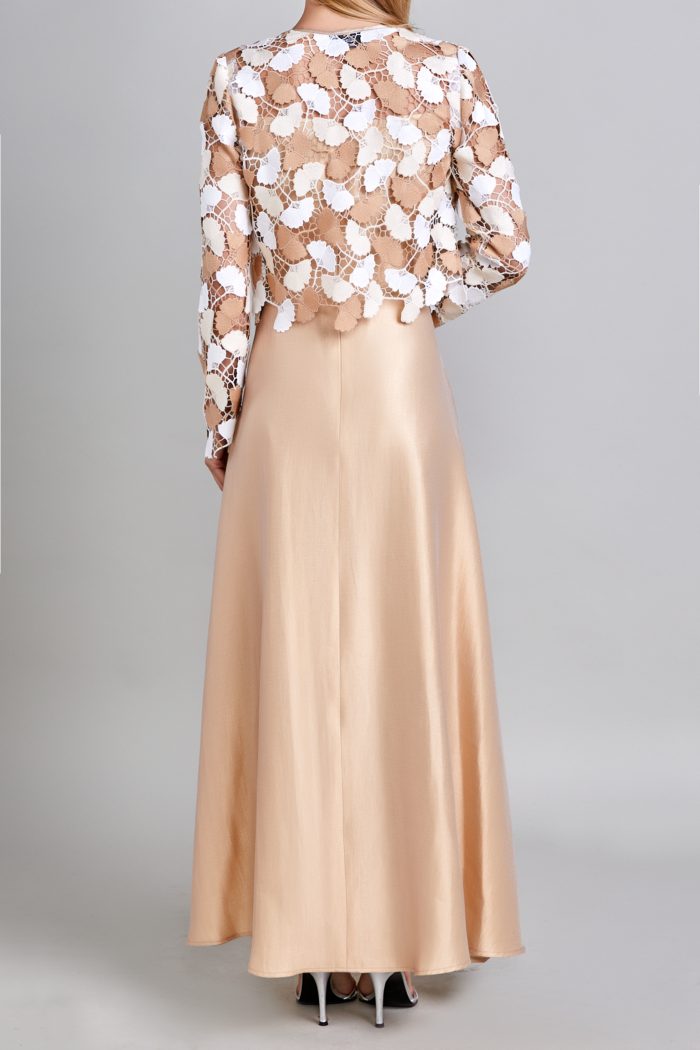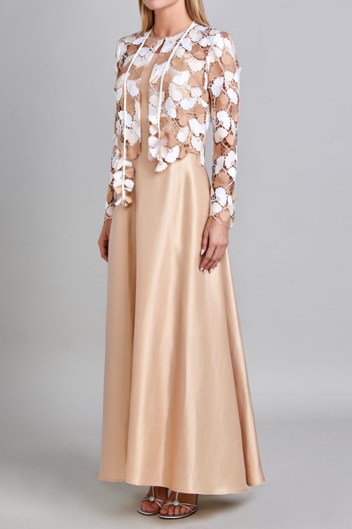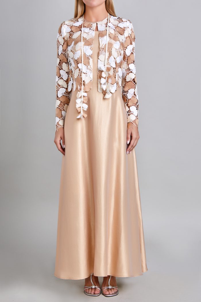 SACO CON ESCOTE REDONDO CON BIES EN TELA LISA. BROCHE DE GANCHO EN EL INTERIOR DE ESCOTE. TALLE DELANTREO CON PINZA DE BUSTO. EN RUEDO LLEVA LA ORILLA DE ENCAJE. DELANTERO FILO LLEVA DOBLES DE TELA PARA FORMAR UNA VISTA. TALLE ESPALDA RECTO CON ORILLA DE TELA EN RUEDO. MANGA LARGA DE UNA PIEZA CON LA ORILLA DE ENCAJE EN PUÑO. PLACA MEXICO EN COSTADO RUEDO IZQUIERDO. PLACA MUSSI EN COSTADO RUEDO IZQUIERDO