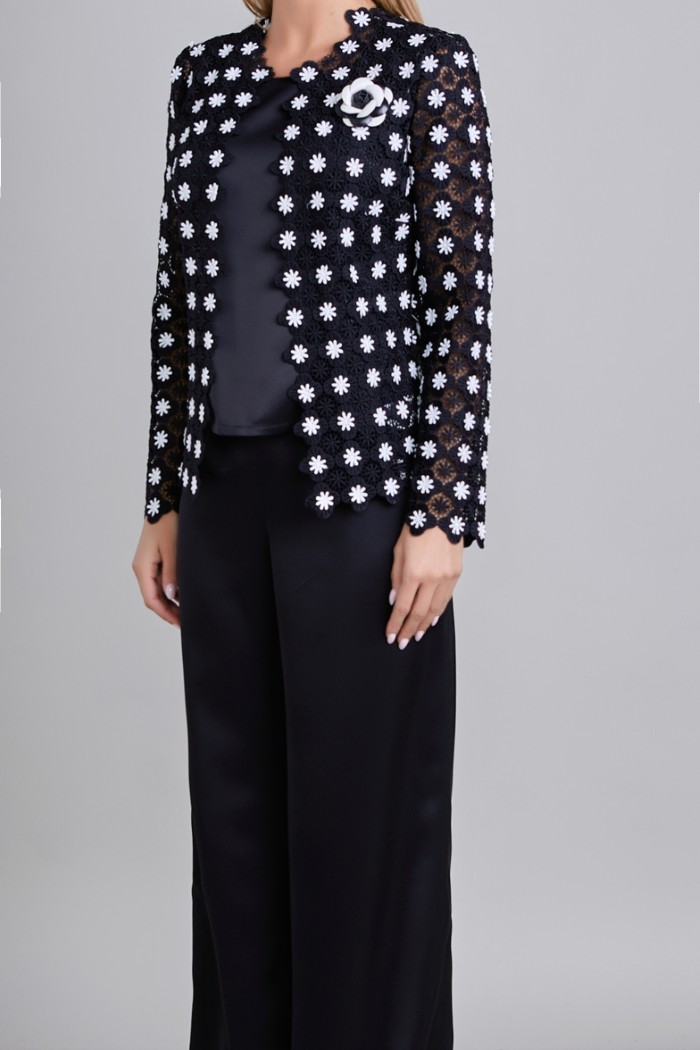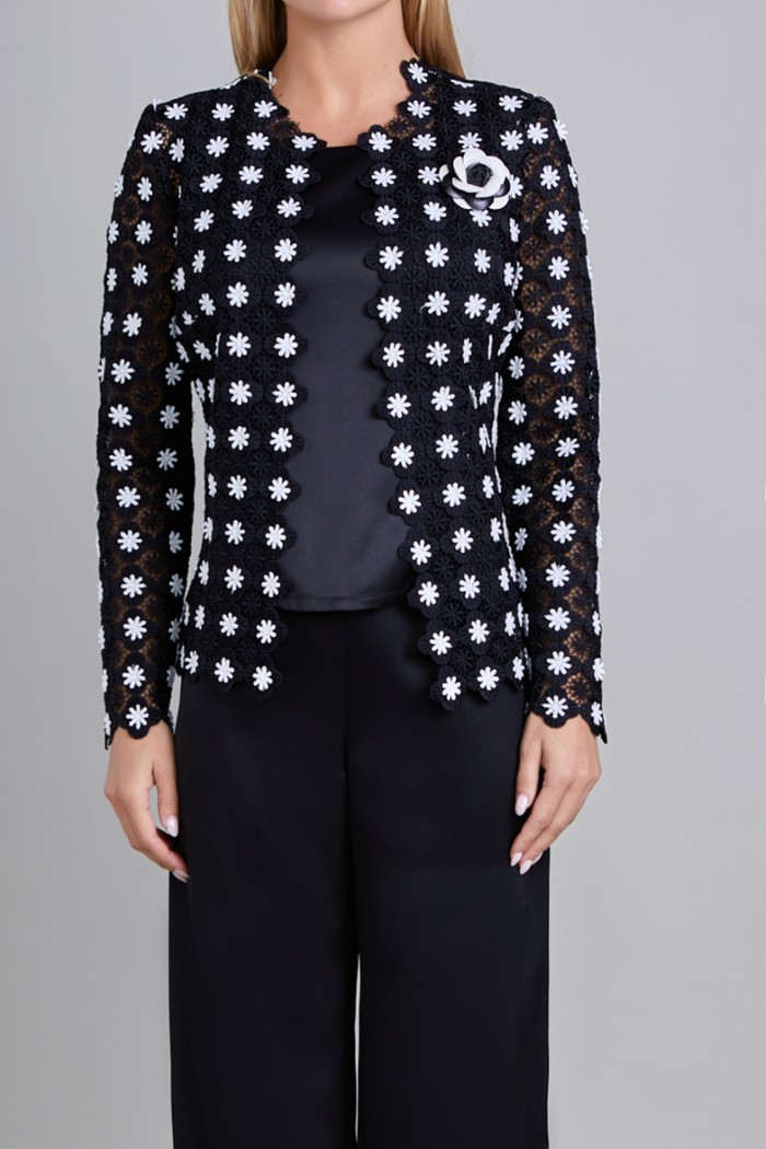SACO CON CUELLO REMI REDONDO SIGUE LA FORMA DE LA FLOR DE TELA. DELANTERO CON FILO DE ENCAJE EN DELANTERO , PINZA DE BUSTO, ORILLA DE RUEDO CON ONDA DE ENCAJE. ESPALDA RECTA CON ONDAS DE TELA EN RUEDO. MANGA LARGA DE UNA PIEZA CON ONDAS DE TELA EN PUÑO. COMO ADORNO UN BROCHE DE FLOR EN LADO IZQUIERDO SUPERIOR. PLACA MUSSI EN RUEDO LADO IZQUIERDO. PLACA MEXICO EN RUEDO IZQUIERDO ABAJO DE LA MUSSI