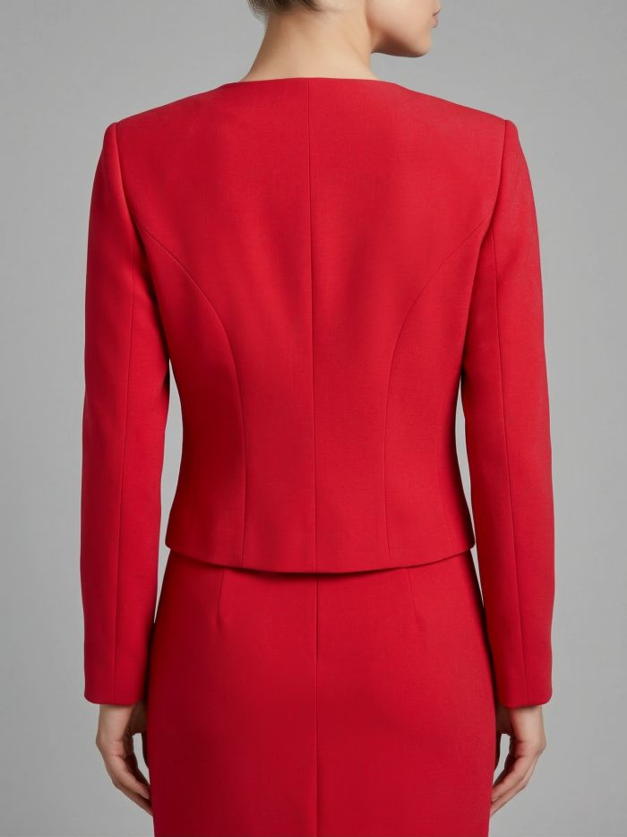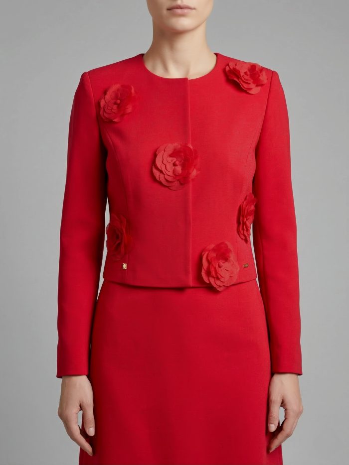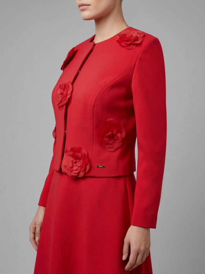 SACO CORTO CON ESCOTE REDONDO. BROCHES DORADOS DE PRESION EN DELANTERO. DELANTERO CON CORTE TIPO PRINCESA Y DE ADORNO EN TALLES LLEVA BROCHES DE FLORES. COSTADILLO RECTO. ESPALDA CON CORTE TIPO PRINCESA. MANGA LARGA DE DOS PIEZAS. PLACAS EN RUEDO LADO DERECHO MEXICO. PLACA MUSSI LADO IZQUIERDO