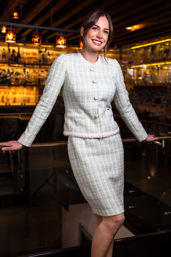 SACO CON ESCOTE REDONDO CON TIRA DE PERLAS EN CONTORNO. TALLE DELANTERO CON CORTE TIPO PRINCESA, ABROCHA CON 5 BROCHES Y 5 BOTONES (BOTON DE ADORNO). TIRA SIMULANDO VIVOS EN CINTURA Y TIRA EN RUEDO EN DELANTERO. COSTADILLO RECTO, ESPALDA CON CORTE TIPO PRINCESA Y MANGA LARGA DE DOS PIEZAS. FORRO DE TAFETA EN EL INTERIOR PLACA EN CINTURA LADO IZQUIERDO