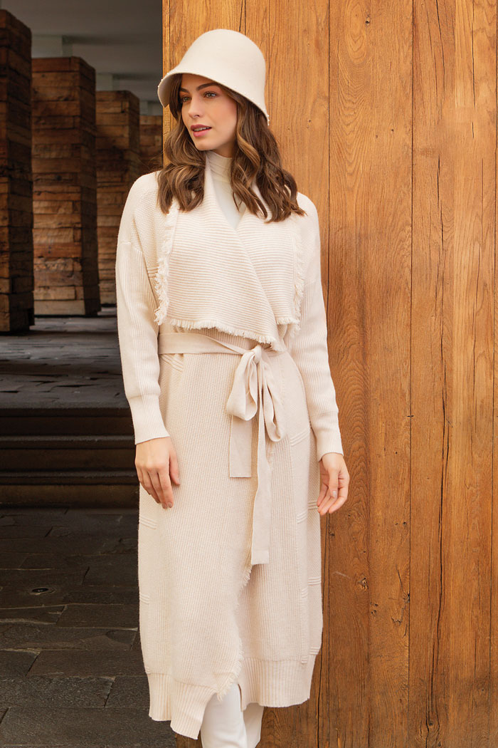 TEJIDO DE PUNTO 40% VISCOSA 35% POLIAMIDA 15% MODAL 10% ELASTANO, MANGA LARGA, CINTURÓN PARA AJUSTE