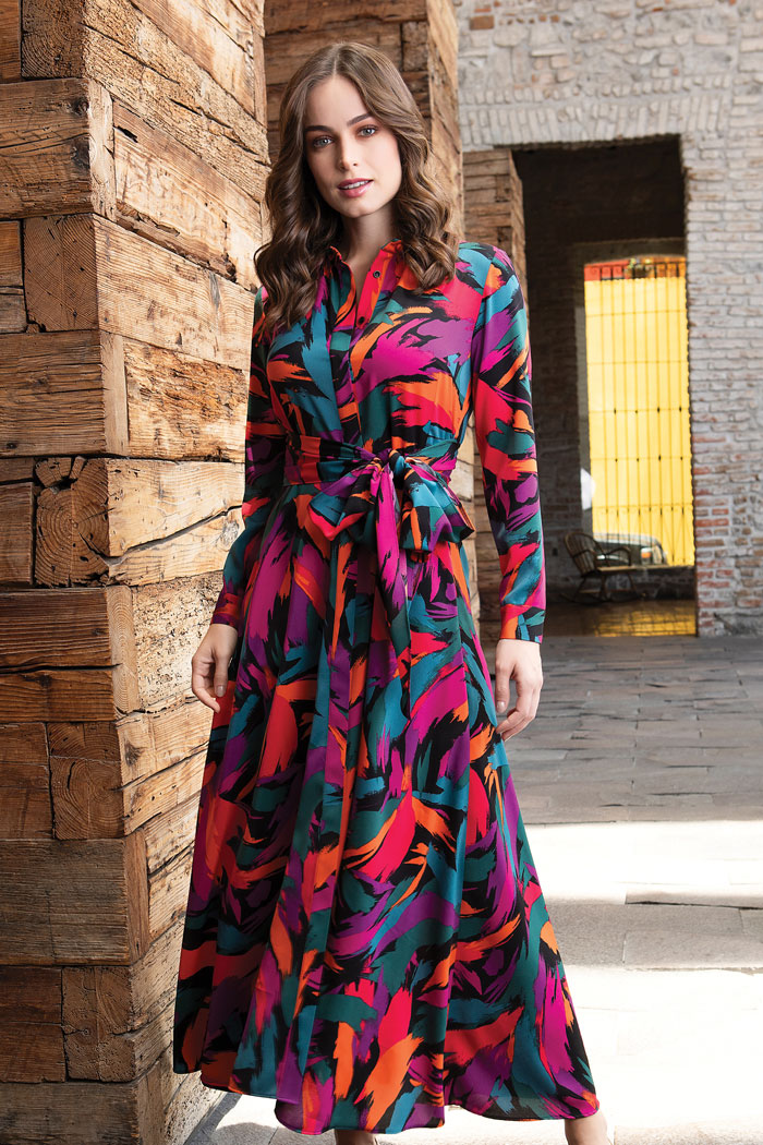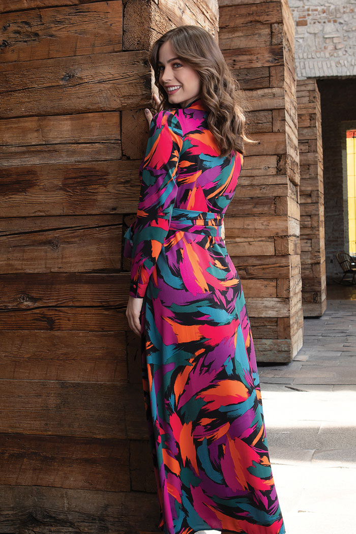 VESTIDO CUELLO Y PIE DE CUELLO CAMISERO, OJAL EN PIE DE CUELLO Y BOTON FORRADO. DELANTERO CON ALETILLA OCULTA CON BOTONES DE PASTA, PINZA LATERAL Y DE BUSTO, CORTE EN CINTURA Y FALDA AMPLIA LARGA CON BOLSAS OCULTAS EN COSTADO. ESPALDA TALLE SUPERIOR CON PINZA LATERAL. CORTE EN CINTURA Y FALDA AMPLIA LARGA MANGA LARGA DE UNA PIEZA CON OJAL Y BOTON FORRADO. PLACA EN CUELLO LADO IZQUIERDO.