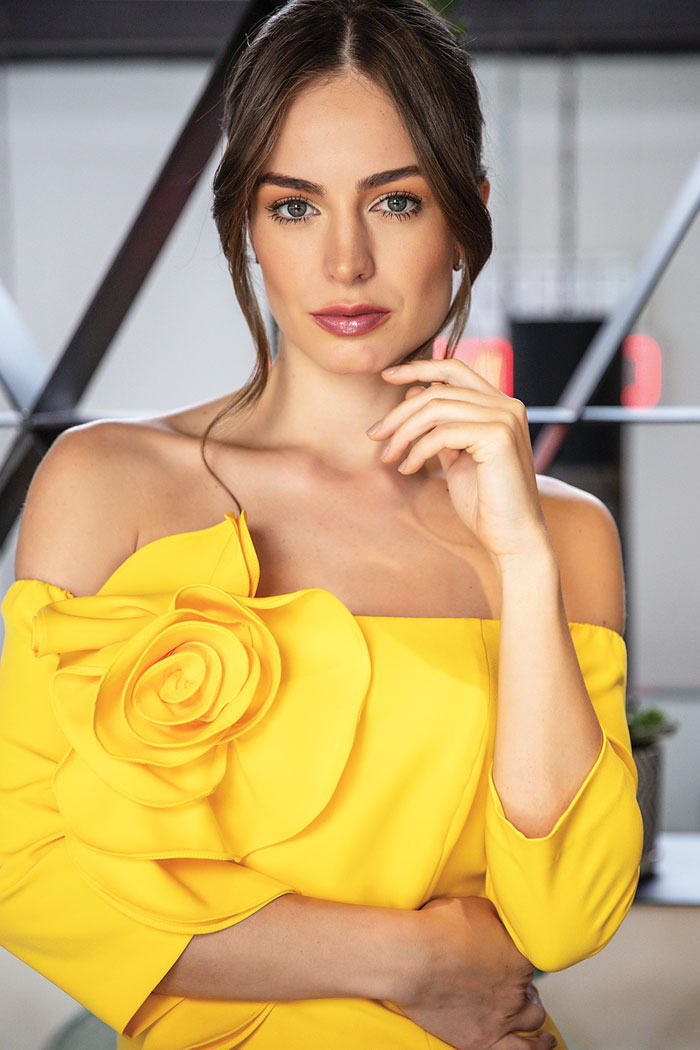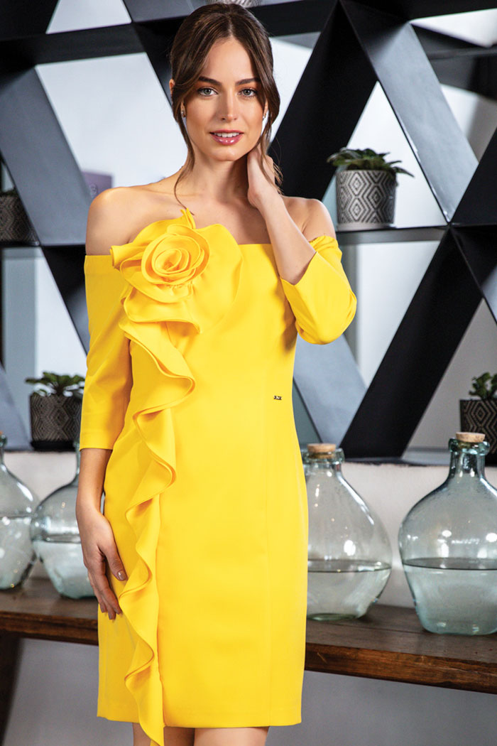 VESTIDO HOMBROS DESCUBIERTOS. TALLE DELANTERO CON CORTES TIPO FRANCES, LADO DERECHO CON ESCAROLA EN EL CORTE Y FLOR DE LA MISMA TELA EN ESCOTE. TALLE ESPALDA CON CORTES TIPO FRANCES, CIERRE INVISIBLE EN CENTRO ESPALDA Y ABERTURA TRACERA EN LA PARTE INFERIOR. MANGA 3/4 DE UNA PIEZA. PLACA EN CINTURA LADO IZQUIERDO