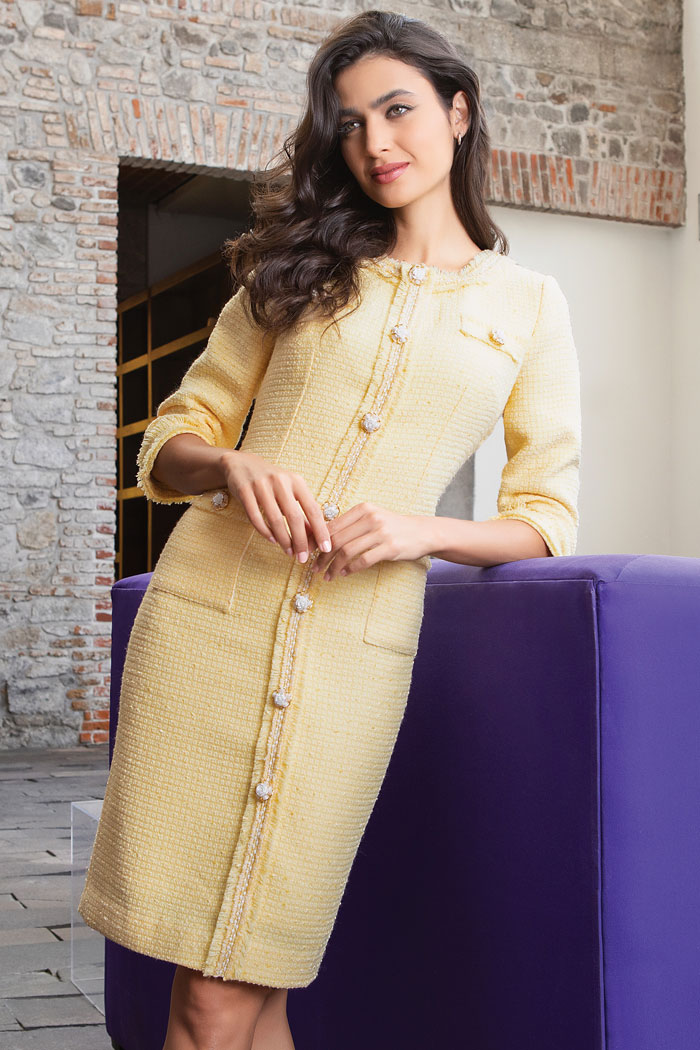 VESTIDO RECTO, ESCOTE REDONDO PIZAS DE COSTADO Y EN TALLE BOLSAS DE PARCHE INFERIORES CON ACABADO DE DESHILADO EN FILO Y UN BOTÓN DE ADORNO, EN LA PARTE SUPERIOR VÁ LA MISMA IDEA SOLO EL VIVO DESHILADO Y EL BOTÓN YEA ESCOTE Y CENTRO IGUAL SOLO QUE SE ANEXA UNA TIRA BORDADA Y BOTONES. ESPALDA ESCOTE REDONDO, PINZAS EN TALLE Y CIERRE INVISIBLE AL CENTRO TERMINANDO CON ABERTURA DE BESO Y MANGA 3/4 DE UNA PIEZA CON DESHILADO EN FILO. LA PRENDA VA FORRADA.