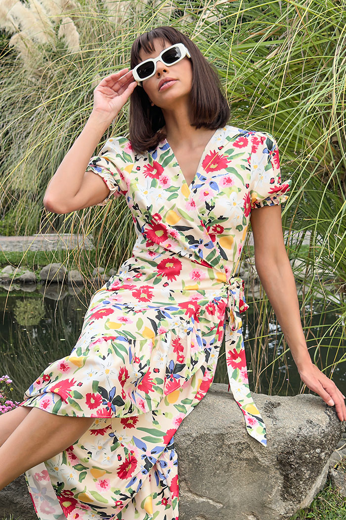 VESTIDO LARGO, TEJIDO ESTAMPADO, MANGA CORTA