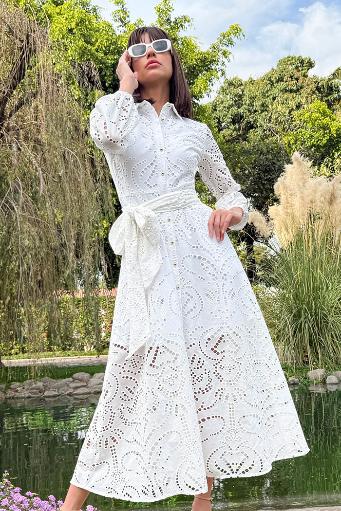 VESTIDO: CUELLO CAMISERO CON PIE DE CUELLO. BOTONES DORADOS DE BOLA. TALLE DELANTERO SUPERIOR, CON PINZA DE BUSTO Y LATERAL, ALETILLA DE LA MISMA TELA, FALDA LARGA Y AMPLIA CON ALETILLA LLEVA BOLSAS EN COSTADO. ESPALDA SUPERIOR CON PINZA LATERAL, FALDA LARGA CON AMPLITUD. MANGA LARGA CON AMPLITUD EN PUÑO Y ELASTICO EN EL INTERIOR FORRO DE ALGODON FALDA A ALTURA RODILLA. CINTURON DE LA MISMA TELA. PLACA DORADA EN CUELLO LADO IZQUIERDO