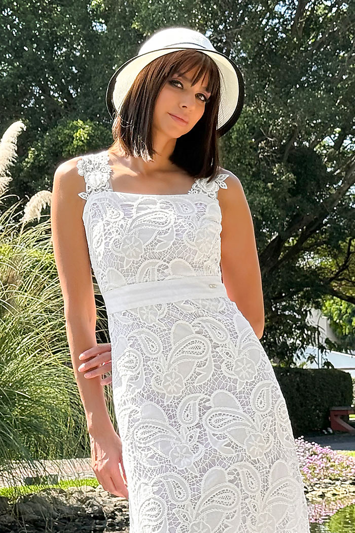 VESTIDO: EN TEJIDO DE GUIPIURE, ESCOTE TIPO STRAPLESS, CON TIRANTES EN TIRA BORDADA DE FLORES EN UNA BASE TRANSPARENTE, CORTE DE PRETINA EN TELA LISA DE LA MISMA Y FALDA CON AMPLITUD. ESPALDA: MISMA IDEA QUE EL DELANTERO CON CIERRE AL CENTRO. VÁ SISADO. LA PRENDA VÁ FORRADA.