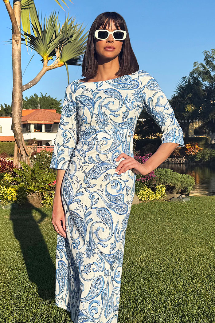 VESTIDO: EN TELA ESTAMPADA, ESCOTE OJAL, PINZAS DE COSTADO Y EN TALLE, CORTE DE PRETINA EN CINTURA CON AMPLITUD EN LA FALDA. ESPALDA: ESCOTE OJAL, PINZAS EN TALLE, CORTE DE PRETINA EN CINTURA LLEVA CIERRE INVISIBLE AL CENTRO CON AMPLITUD EN LA FALDA. MANGA: 3/4 DE UNA SOLA PIEZA. LA PRENDA NO LLEVA FORRO.