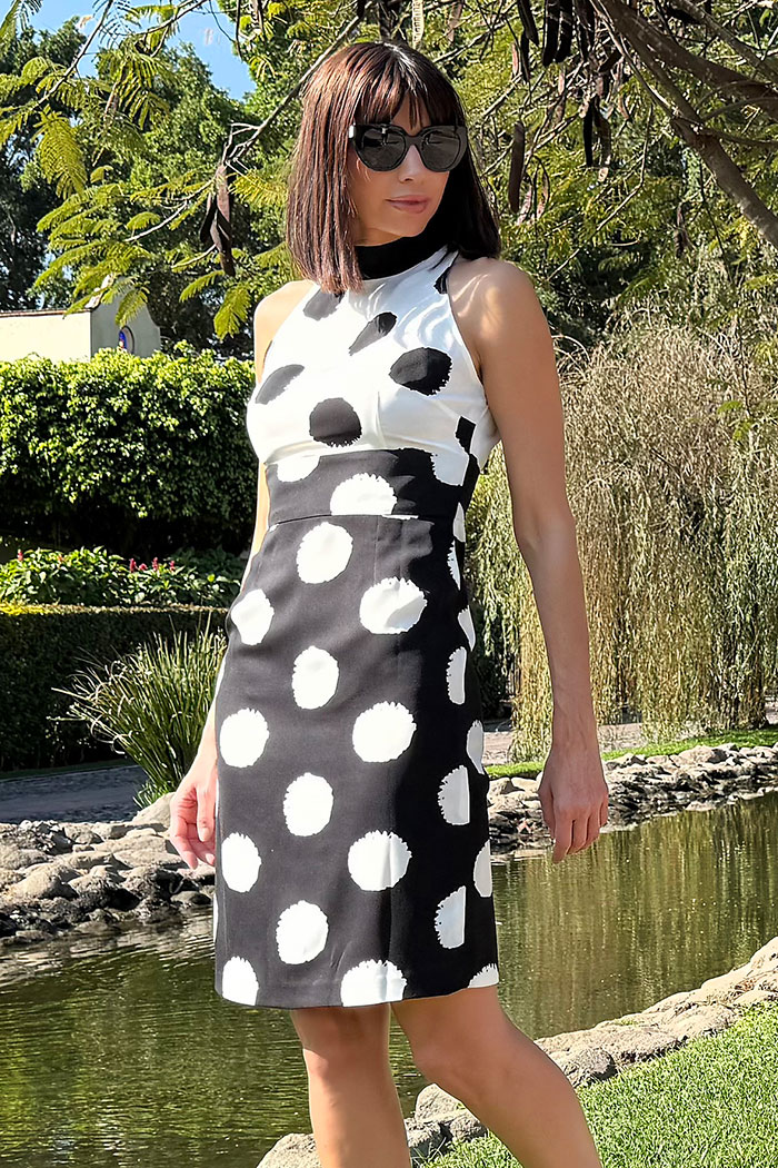 VESTIDO: TALLE CON CUELLO MAO, DELANTERO CON PINZA DE COSTADO A BUSTO Y EN EL TALLE, CORTE EN LA CINTURA SIMULANDO PRETINA, SISAS CON BIES. ESPALDA CON PINZAS EN EL TALLE, CIERRE INVISIBLE Y ABERTURA DE BESO. TALLE Y FALDA CON TELAS EN CONTRASTE