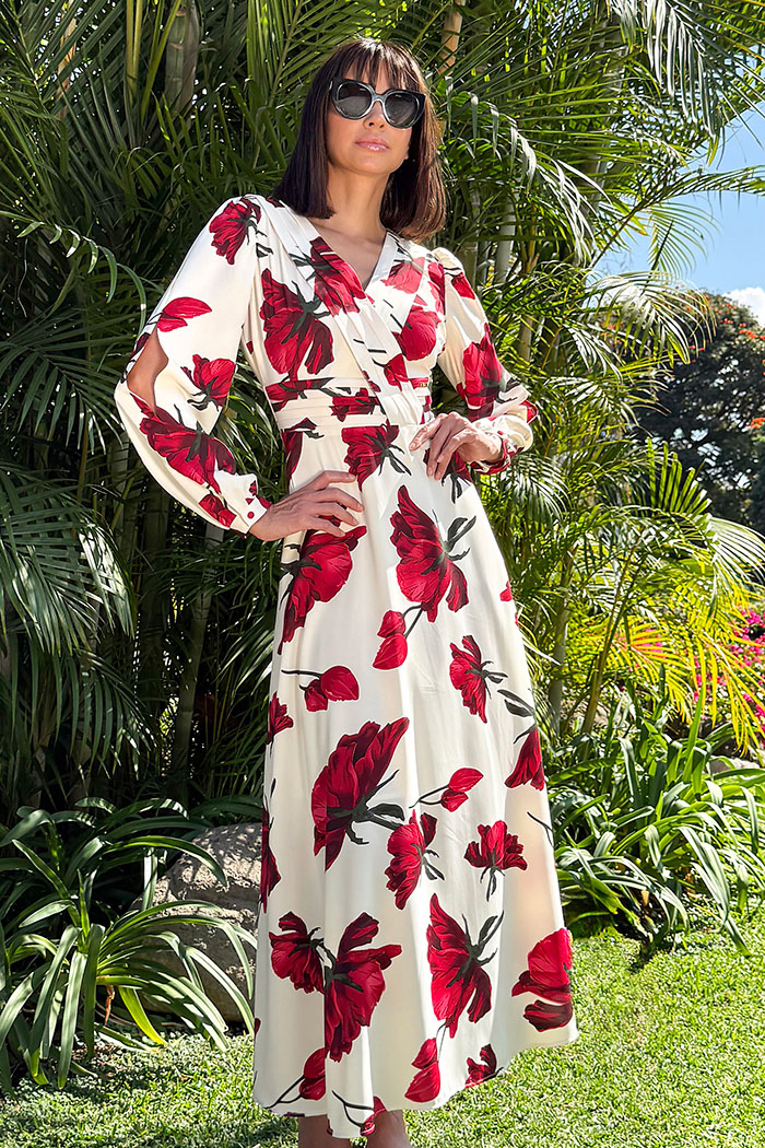 VESTIDO: ESCOTE EN V CON CRUCE, FILO DELANTERO CON TABLEADO LADO DERECHO BAJA HASTA LA CINTURA , LADO IZQUIERDO LLEGA A LA CINTURILLA, PINZA LATERAL Y DE BUSTO, CINTURILLA TABLEADA. FALDA LARGA Y AMPLIA. ESPALDA CON CIERRE EN CENTRO ESPALDA, PINZA LATERAL, CINTURILLA TABLEADA Y FALDA LARGA Y AMPLIA. MANGA LARGA DE DOSPIEZAS CON ABERTURA EN CENTRO MANGA Y PUÑO ANGOSTO CON BOTON FORRADO. FORRO SOLO EN FALDA DEL VESTIDO.