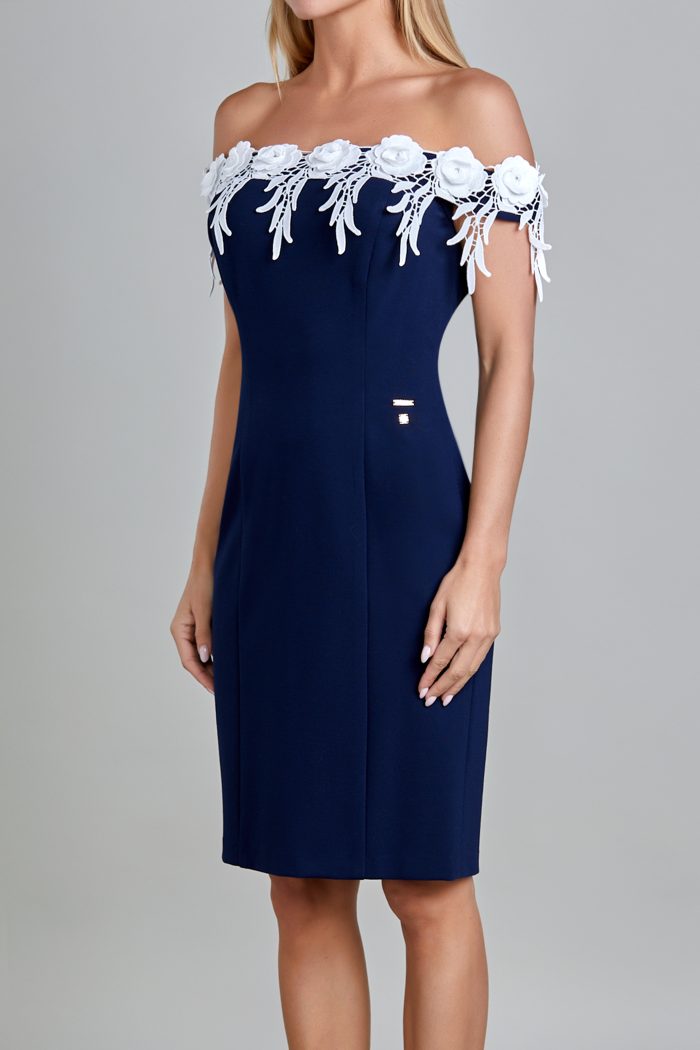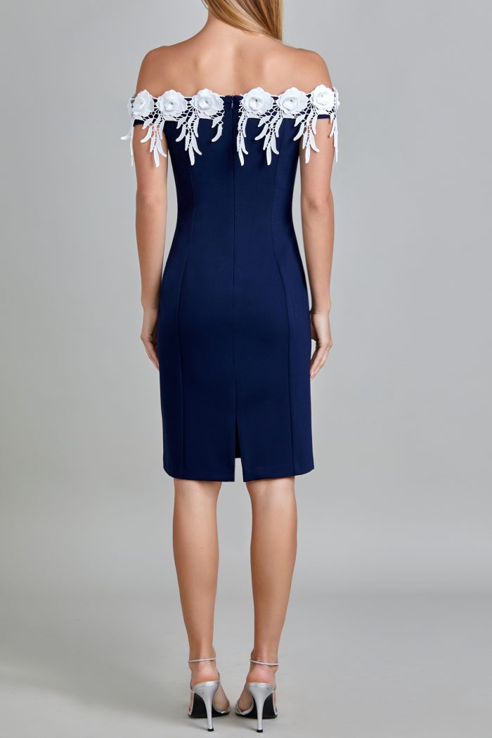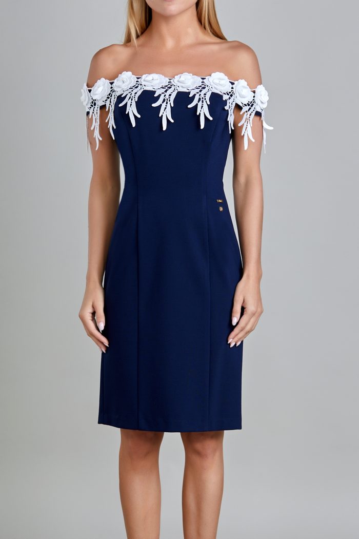VESTIDO DE HOMBROS DESCUBIERTOS. TIRA DE FLORES BLANCA EN CONTORNO ESCOTE. TALLE DELANTERO CON CORTE TIPO FRANCES. TALLE ESPALDA CON CORTE TIPO FRANCES, CIERRE EN CENTRO ESPALDA Y ABERTURA DE BESO EN LA PARTE INFERIOR. EN LA PARTE DE BRAZO LLEVA PIEZA DE LA MISMA TELA CON ELASTICO PARA SUJETAR EL BRAZO. PLACAS EN CINTURA LADO IZQUIERDO PLACA MUSSI ARRIBA Y PLACA MEXICO ABAJO