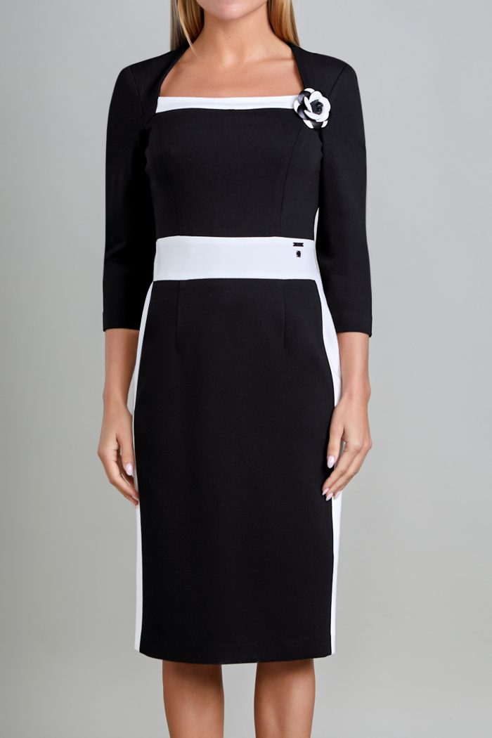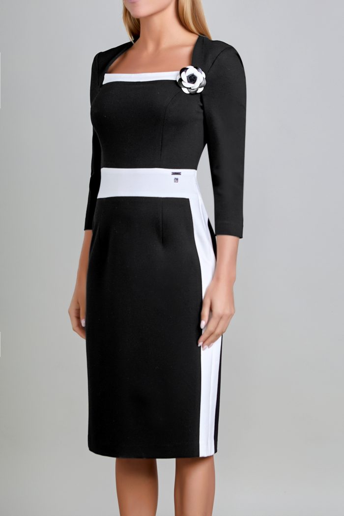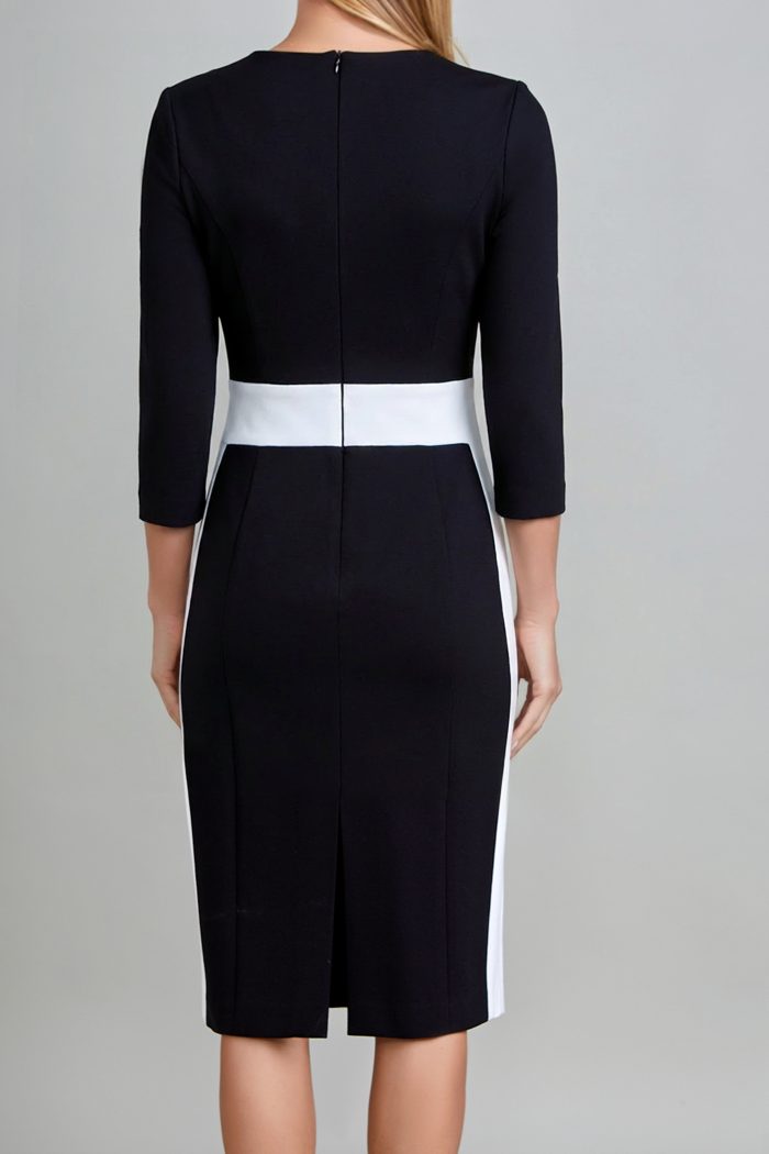 VESTIDO RECTO, ESCOTE CUADRADO DIAGONAL CON COMBINACIÓN EN EL MISMO, CORTE PRINCESA, CORTE EN CINTURA TIPO PRETINA EN COMBINACIÓN IGUAL QUE EN CORTES DE COSTADO INFERIORES. ESPALDA:ESCOTE REDONDO CORTE PRINCESA CON LA MISMA IDEA DEL DELANTERO, CIERRE INVISIBLE AL CENTRO TERMINANDO CON ABERTURA DE BESO. MANGA:3/4 DE UNA PIEZA. LA PRENDA NO LLEVA FORRO.