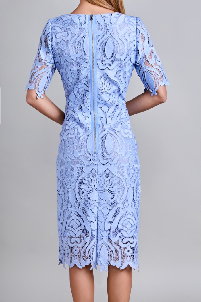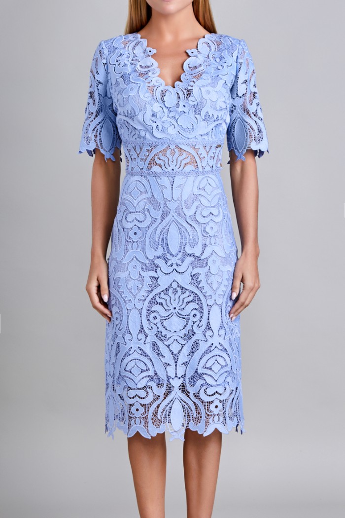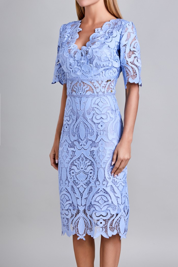 VESTIDO:EN TEJIDO DE GUIPIURE, ESCOTE CRUZADO EN “V” CON ORILLA EN FILO, CORTE EN CINTURA TIPO PRETINA CON TIRAS DE ENCAJE EN AMBOS LADOS Y FALDA RECTA CON ORILLA EN RUEDO. ESPALDA:COMPLETA, ESCOTE REDONDO, CIERRE METÁLICO AL CENTRO Y TERMINA CON ABERTURA DE BESO, TAMBIÉN CON ORILLA EN RUEDO. MANGA:CORTA DE UNA PIEZA CON ORILLA EN FILO. LA PRENDA LLEVA FORRO SOLO EN EL CUERPO.