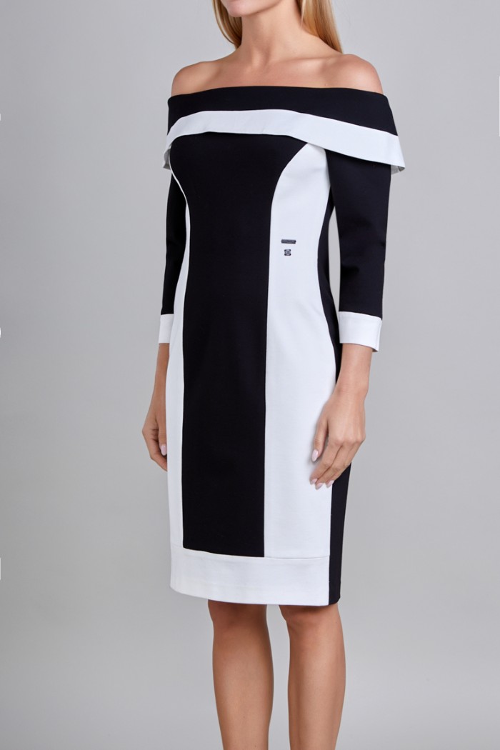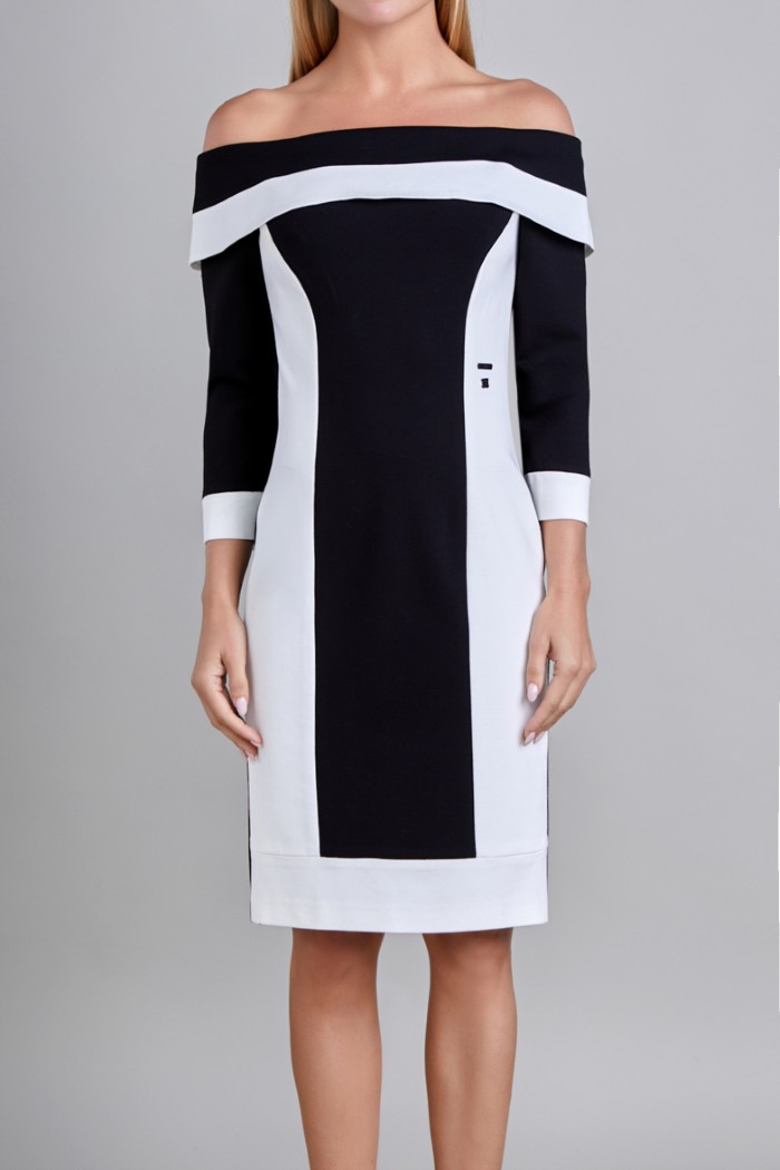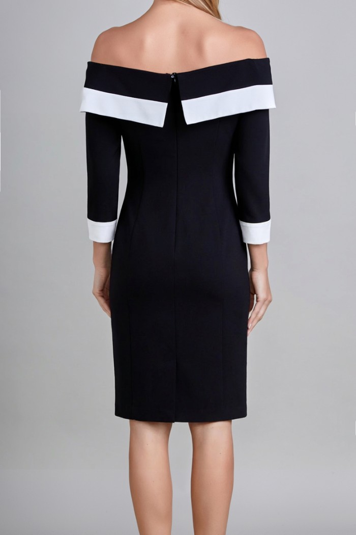 VESTIDO CORTE PRINCESA EN COMBINACIÓN , CON EL HOMBRO DESCUBIERTO Y CUELLO EN DOS COLORES, LLEVA UNA INCRUSTACIÓN EN EL RUEDO DELANTERO , ESPALDA CORTE PRINCESA Y CIERRE EN EL CENTRO. MANGA 3/4 CON UNA INCRUSTACIÓN EN EL PUÑO.