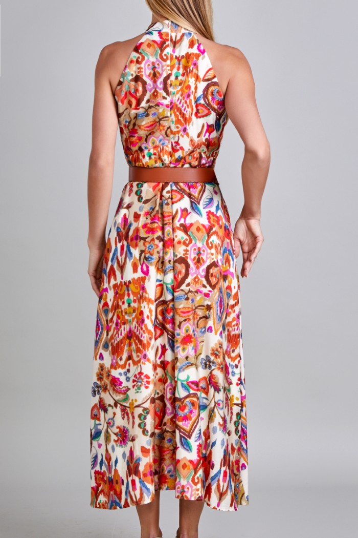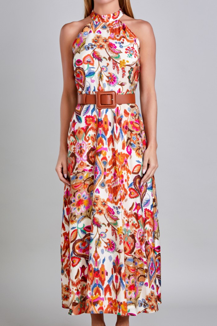 VESTIDO HALTER CUELLO MAO, DELANTERO CON PINZAS DE COSTADO A BUSTO Y PINZAS LATERALES DE CINTURA. PRETINA AMNGOSTA FALDA CON VUELO, ESPALDA CORTE EN EL CENTRO CON CIERRE Y PREETINA ANGOSTA FALDA CON VUELO ,LLEVA BOLSAS DE COSTADO.