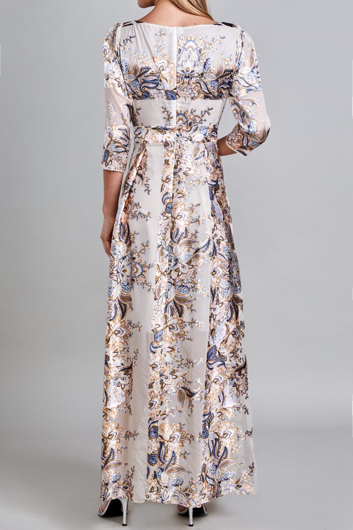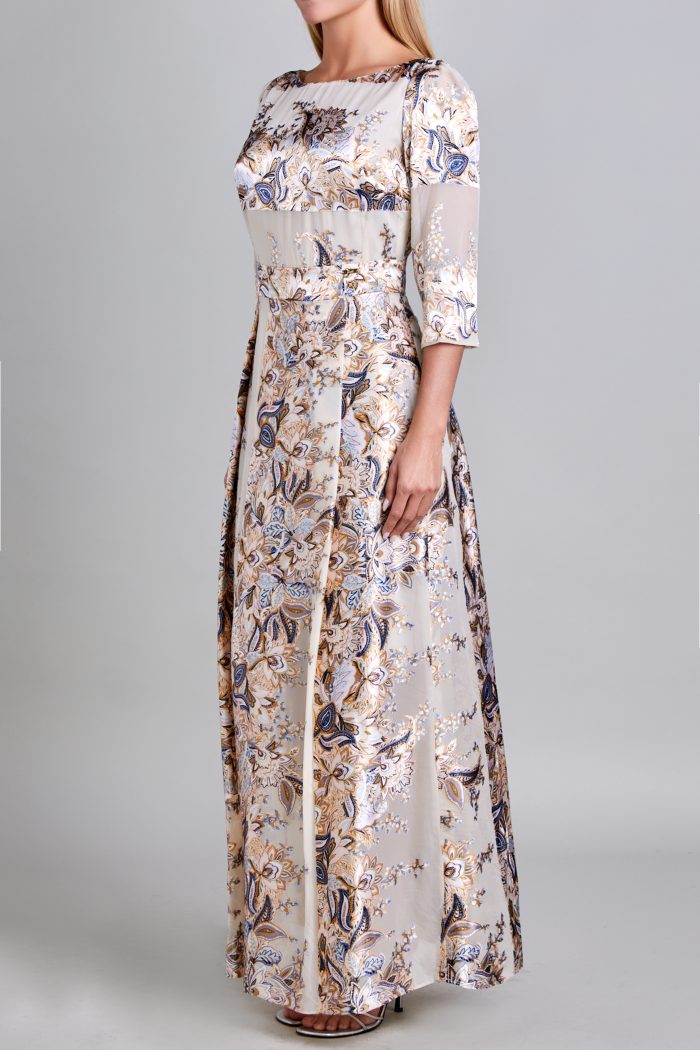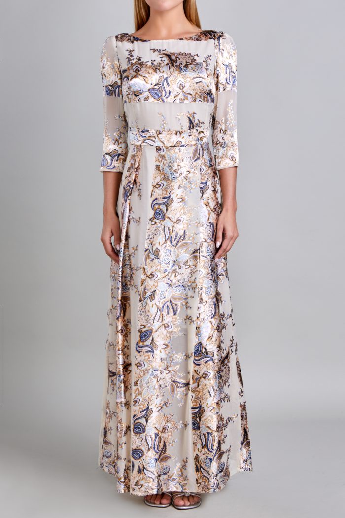 VESTIDO ESCOTE DE OJAL CON PINZAS LATERALES DE COSTADO A BUSTO , PRETINA EN CINTURA Y 2 TABLONES EN LA FALDA DELANTERA ESPALDA CON CIERRE Y 2 TABLONES EN LA ESPALDA DE LA FALDA , MANGA 3/4