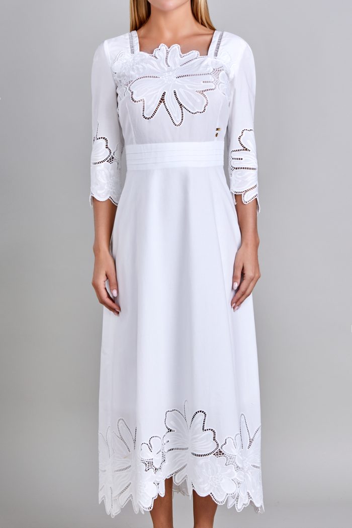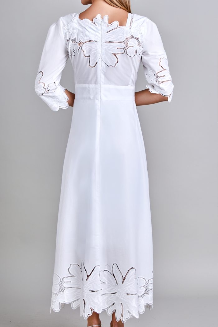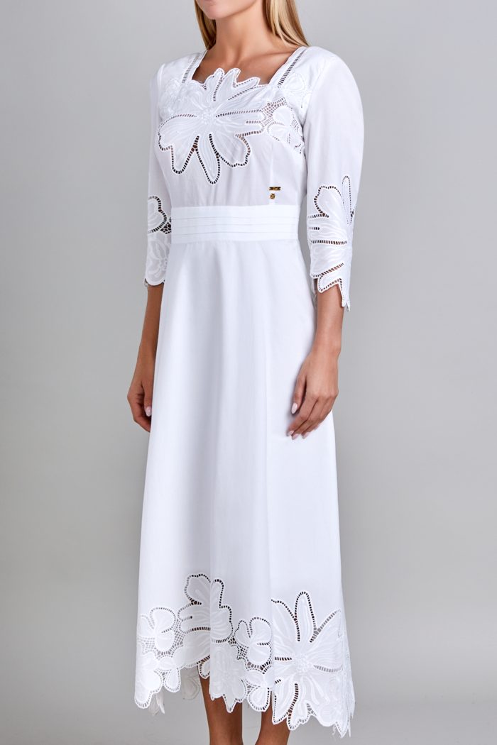 VESTIDO ESCOTE CUADRADO CON FLOR EN CENTRO PINZAS DE COSTADO A BUSTO Y PINZAS LATERALES DE CINTURA. PRETINA CON 3 ALFORZAS HORIZONTALES FALDA CON ORILLA DE FLORES, ESPALDA CON PRETINA Y CIERRE EN EL CENTRO. MANGA 3/4 CON FLORES EN LA ORILLA.