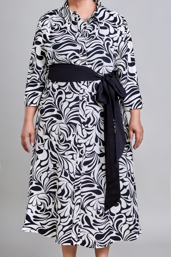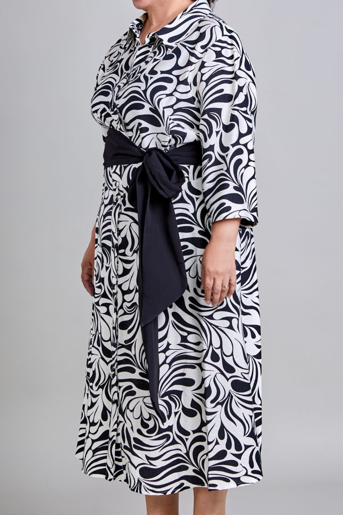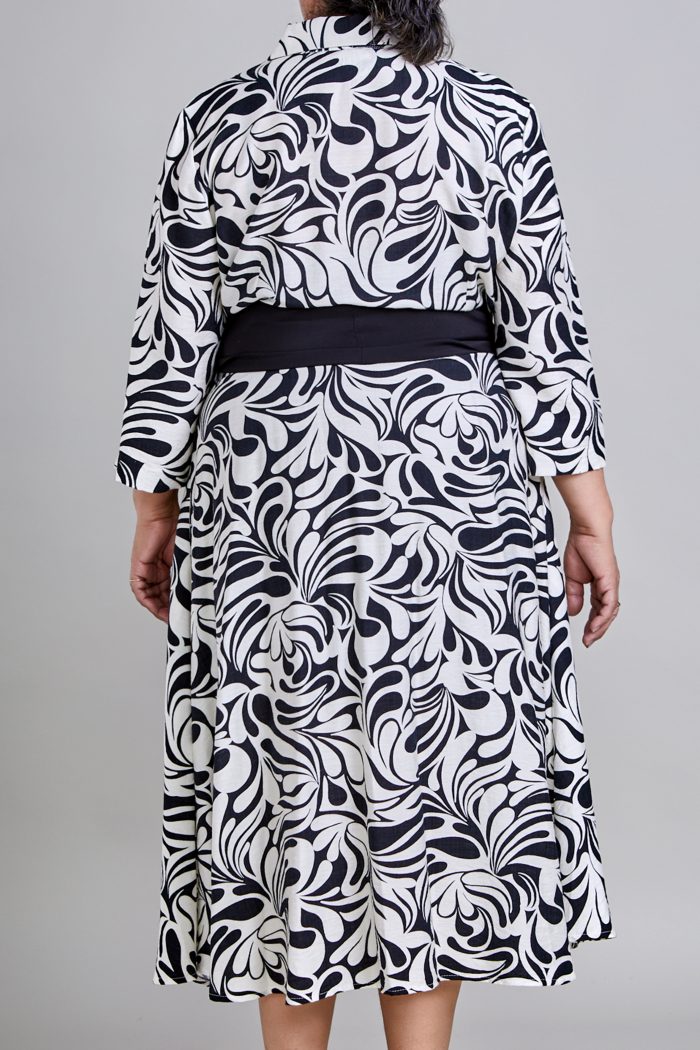 VESTIDO CON CUELLO Y PIE DE CUELLO CAMISERO. BROCHE DE FLOR NEGRA EN DELANTERO IZQUIERDO SUPERIOR. ALETILLA EN FILO DE DELANTERO Y FALDA. TALLE DELANTERO CON PINZA DE BUSTO Y LATERAL , CORTE EN CINTURA Y FALDA AMPLIA. LARGO MIDI. ESPALDA CON PINZA LATERAL, CORTE EN CINTURA Y FALDA AMPLIA. MANGA 3/4 DE UNA PIEZA. CINTURON NEGRO EN TELA LISA. PLACA MUSSI EN DELANTERO SUP LADO IZQUIERDO. PLACA MEXICO ABAJO DE LA PLACA MUSSI