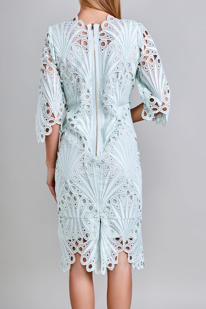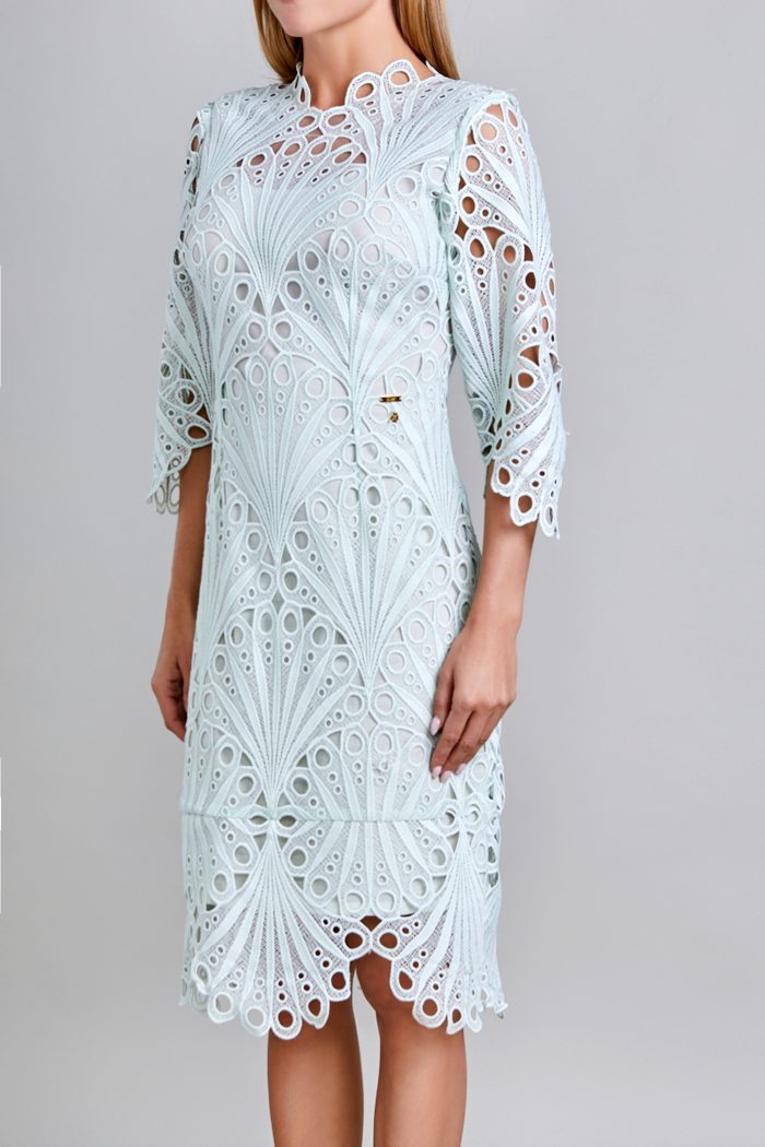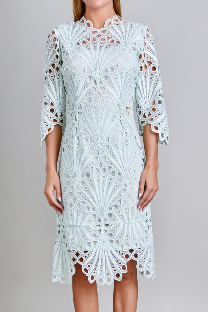 VESTIDO ESCOTE REDONDO OCUPANDO EL DISEÑO DE LA TELA, PINZAS DE COSTADO Y EN TALLE. ESPALDA:ESCOTE REDONDO CON LA MISMA IDEA DEL FRENTE, PINZAS EN TALLE, CIERRE METÁLICO AL CENTRO TERMINANDO CON ABERTURA DE BESO. MANGA:LARGA DE UNA PIEZA. LA PRENDA LLEVA FORRO SOLO EN EL CUERPO.
