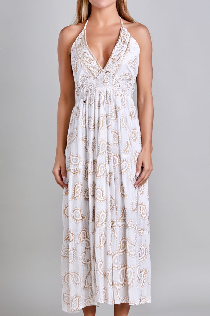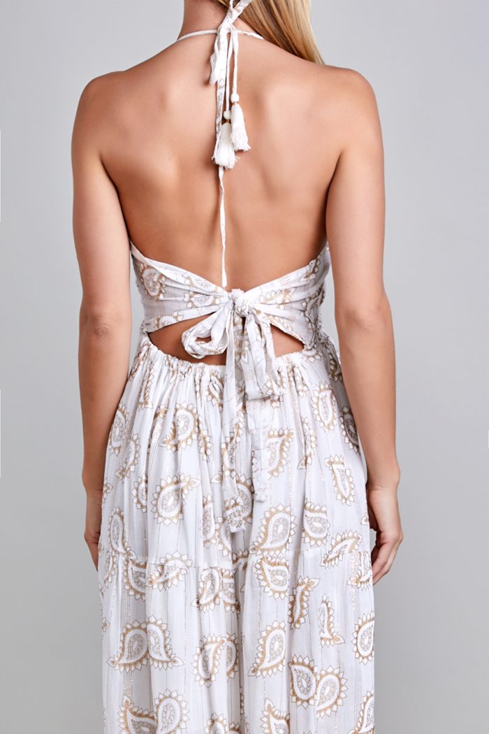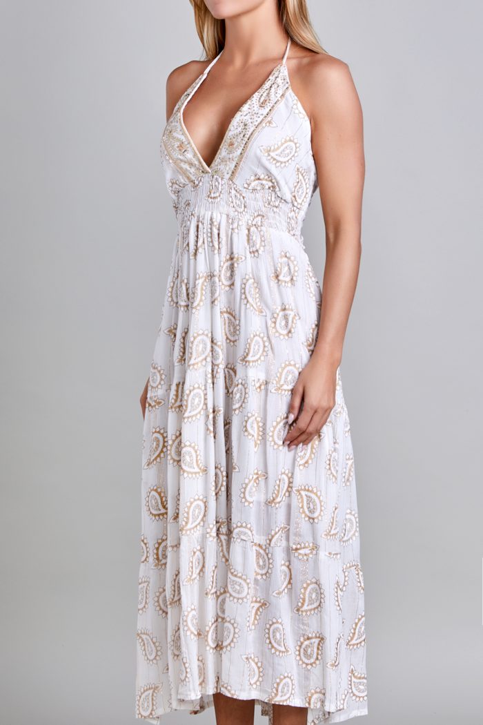 VESTIDO HALTER, SMOCK EN CINTURA, RESORTE EN ESPALDA