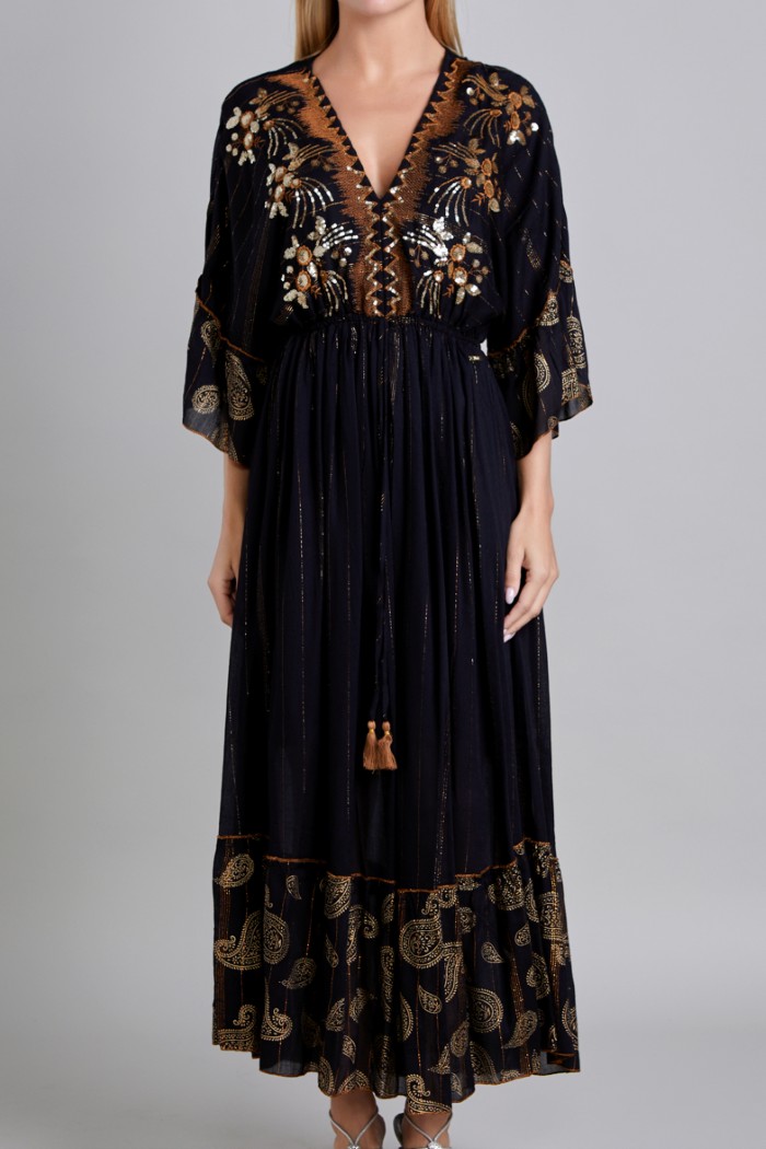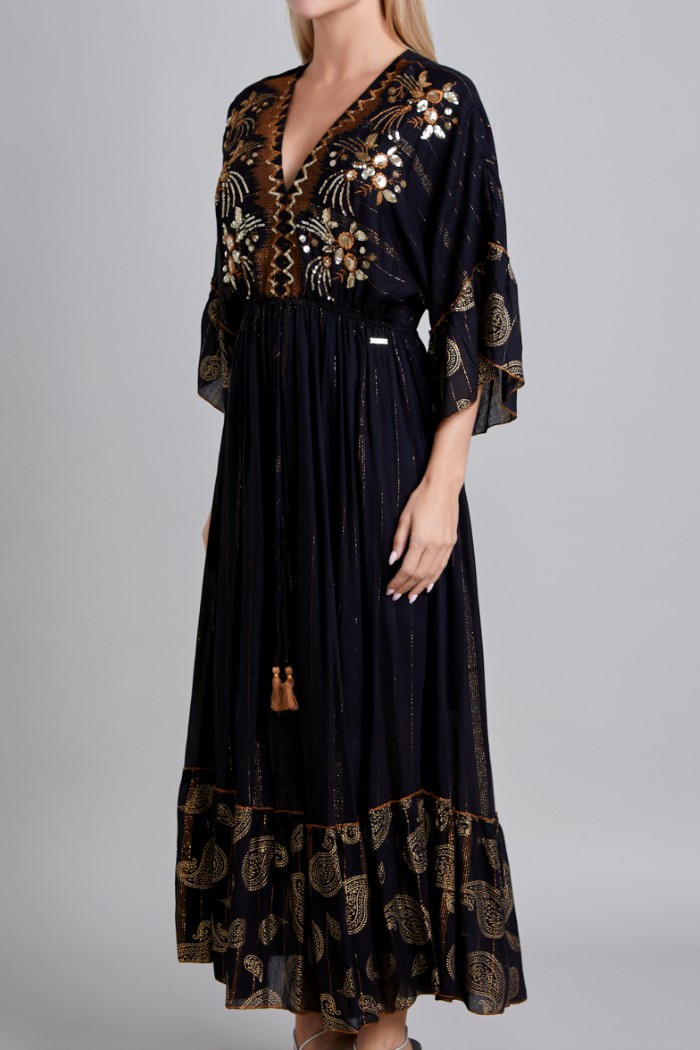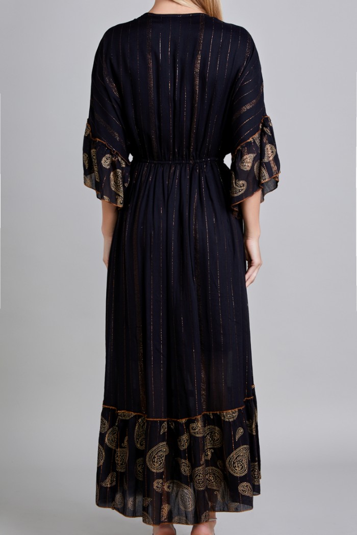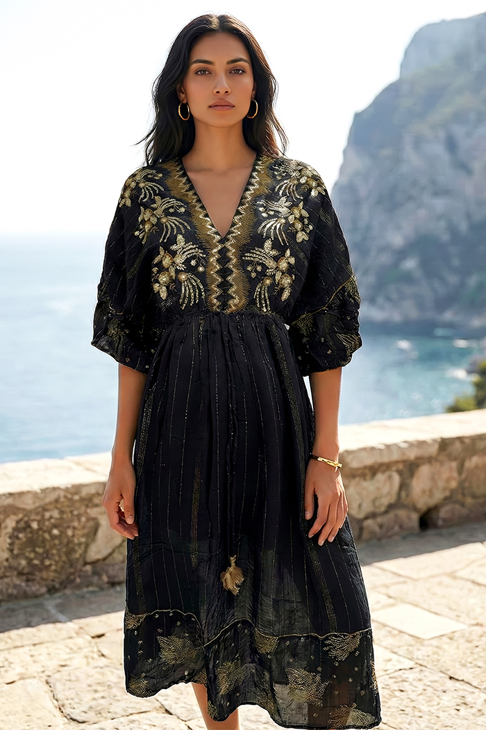 VESTIDO MANGA 3/4, ESCOTE EN V, RESORTE EN CINTURA