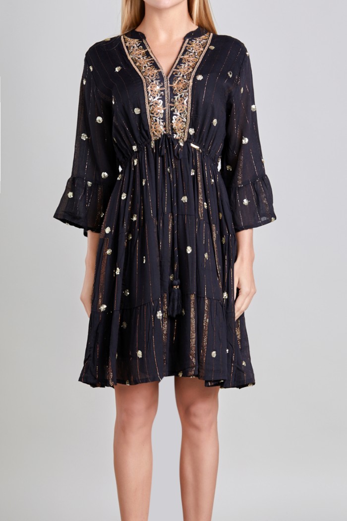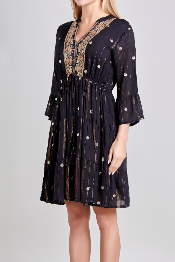 VESTIDO MANGA 3/4, CUELLO MAO, ESCOTE EN V, RESORTE EN CINTURA